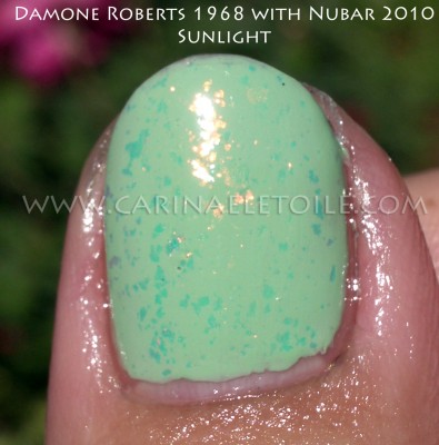 As for the Damone Roberts one, I had originally been wearing Knight’s Armor on my left hand and DR1968 on the other. Hah. I liked how DR1968 looked on my right hand, so I took off KA (as you might see some glitter in the DR1968 swatch) and now all my fingers are sporting DR1968…with one lone exception: my thumb. That has Nubar 2010 on top of it. I was all over the place today.