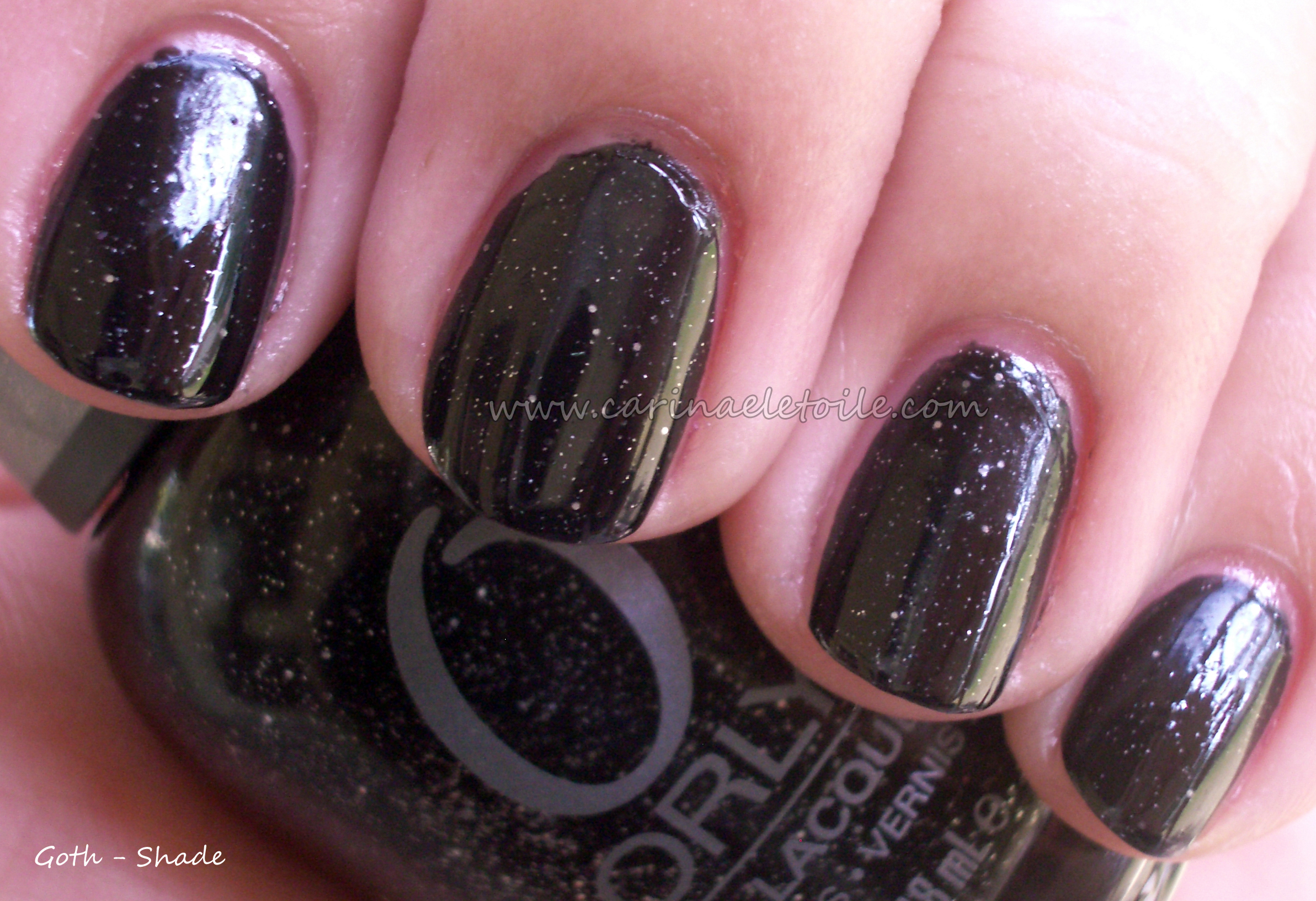 So the little black nail polish wearing, corset sporting, goth girl at heart loves this color…and not because of the name! I’ve always had a tendency to lean towards dark nail polish and this is no exception…even if it has glitter. What I love about this is actually the glitter…it’s silver against black – yay!! – but not only that it’s different sizes: big, medium and small. Very cool. What a way to play on glitter, Orly. Smart move!