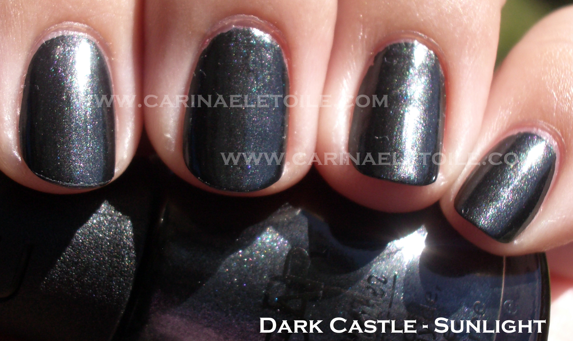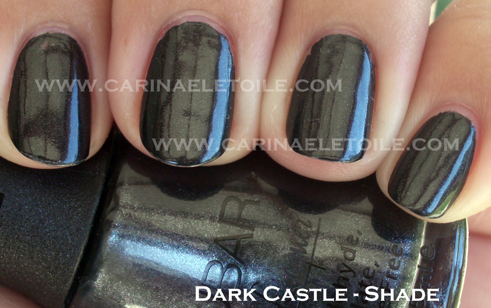 This wasn’t a harsh black, but more of a mellow black with a subtle silver shimmer through it. It appears grey in the bottle but when on me it looked a bit more like charcoal. I think the sun really washed out the potential but if you look at the shade shot it best represents the color.