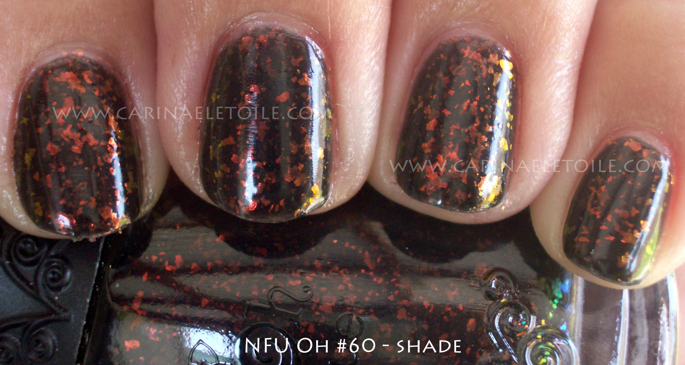 While you can’t see it, there is some wonderful green, blue, gold and orange play in the glitter. You can see the green and blue at the base of the bottle in the shade shot. Then on my nails in the picture above, you see the gold and orange come into play.