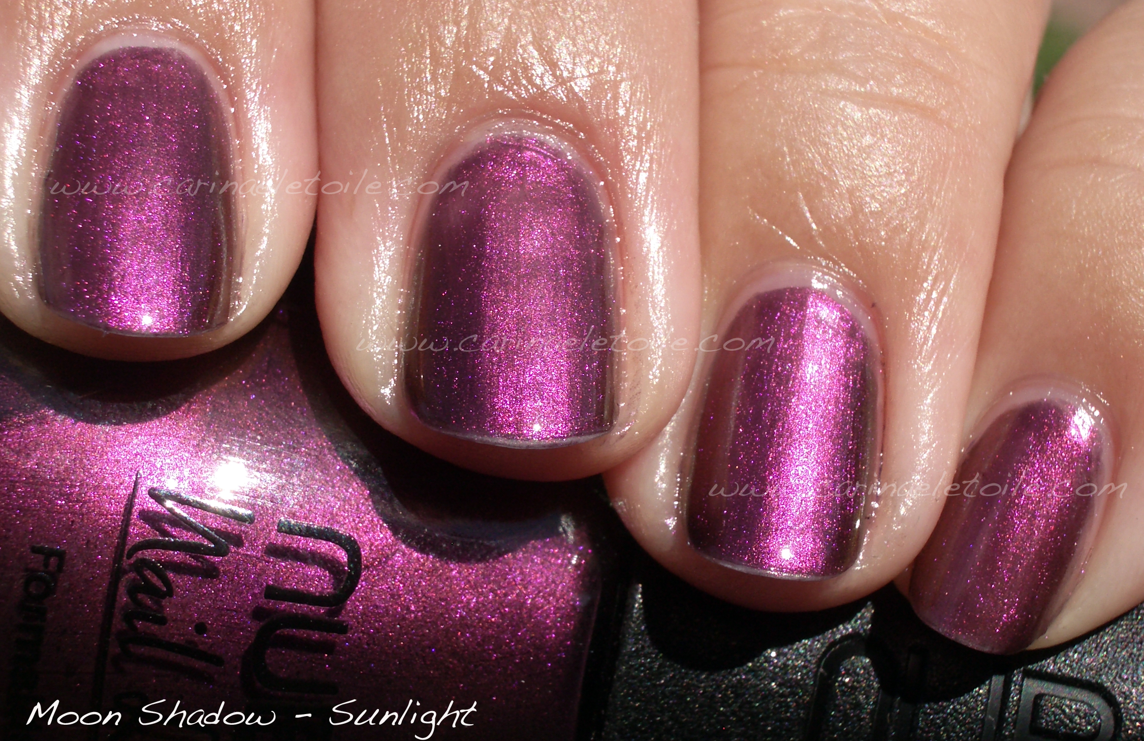 Nonetheless, this polish is beautiful…and I’d recommend it to anyone because it is a gorgeous purple in its own right. Please excuse tip wear – I had been wearing this color for a few days before I snapped the pics. Furthermore, I apologize for the misspelling of Moonshadow on the pics. I had done this a while ago and had thrown away the .psd for it.