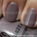 The formula for BD, on the other hand…runny and thin. Hard to work with, but I am wondering if it was just the bottle I got. I did notice that overall the formula for this collection is a bit on the runny side. It had big tendencies for cuticle pull. Not fun. Also, to get the opacity of BD in the picture it took three coats. Channelesque is two coats.