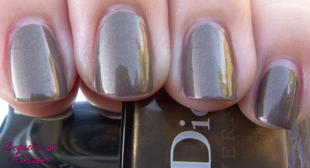Aaaaaanyway, Dior Exquis is part of their Vernis d’Or 2011 Holiday Collection. All the polishes in this collection have a gold theme. This one is no exception. It is, by far, my favorite of the colors. The base is this lovely taupe. It already had me right there because I am a huge fan of taupe/mushroom colors. I was a bit hesitant about the gold in it and I decided to give it a shot. I’m not a fan of gold…why? Because it doesn’t flatter me. It’s too warm for my skin tone. I do envy people who look fabulous in gold, but on me, gold looks flat out tacky and gaudy. I’m tacky and gaudy enough as is, but to throw gold on top of it? Nuh uh. No thanks. I’ll pass!