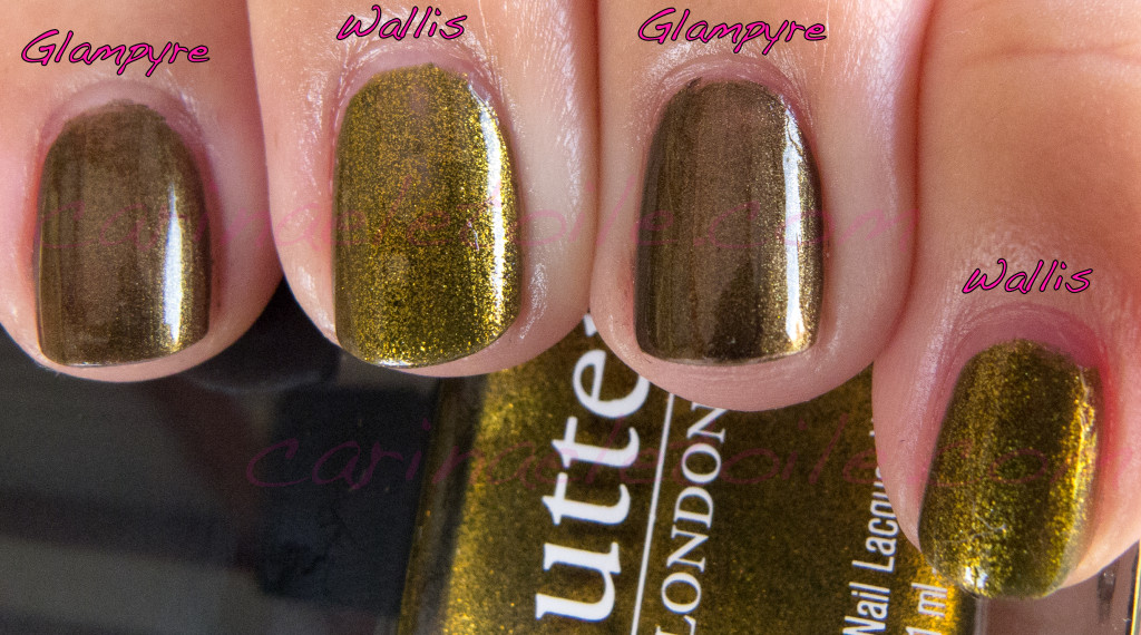 As you can see, Glampyre is a bit more blackened to the point where it’s olive green. Wallis appears to be more golden, more yellow. I still see flecks of the black base. However, I think that Glampyre is a bit more put together. It blends seemlessly and is a bit more refined. Wallis has bigger (is it glass?) flecks that give it a great glowing quality.