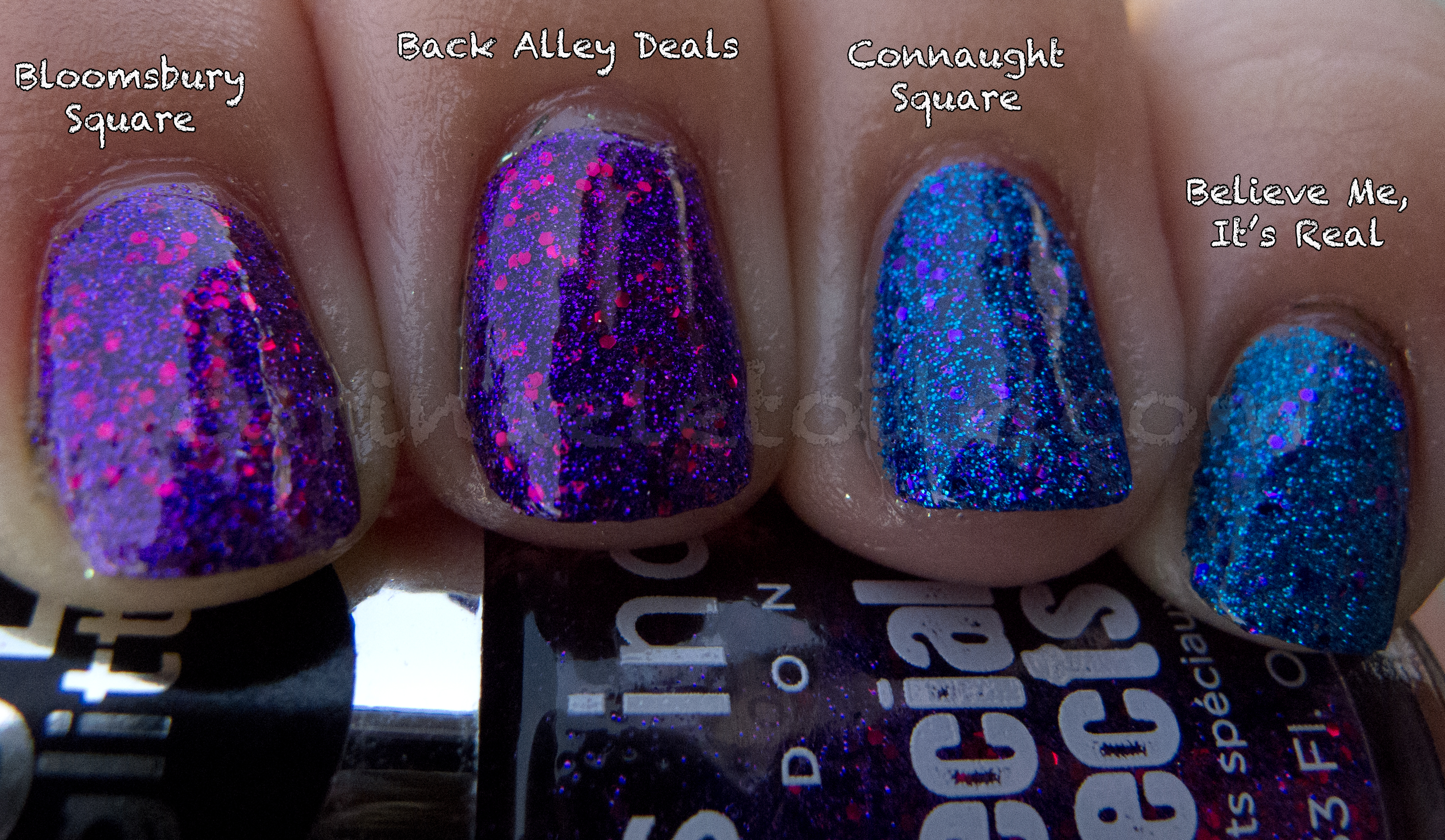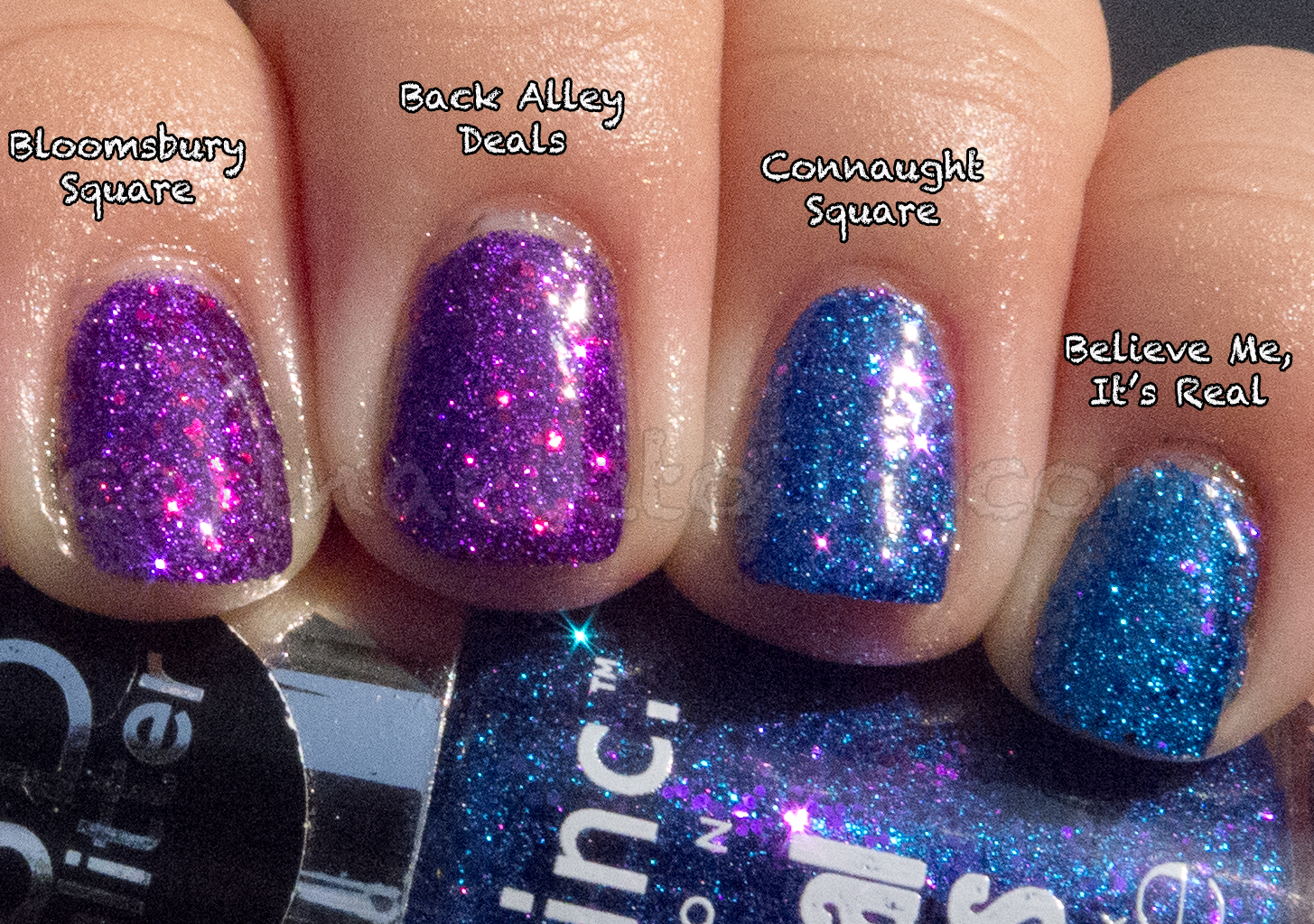 So where is the difference, you ask? I see a tiny discernible difference between BS and BAD – BAD is just a hint darker than BS. Almost like it had a slightly darker tint in the base, but as you can see it is barely noticeable. The glitter is still this dazzling shade of purple with lovely round magenta glitter. The blue in CS is deeper, a bit richer than BM,IR. The purple glitter in CS also a bit more predominant, but I wonder if it’s due to my application and not the formula itself. BM,IR is a a hint of a shade lighter, but it seemed to glow a bit more.