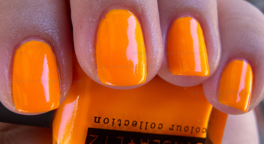 First and foremost – the formula on this is TO DIE FOR! Ginger and Liz Dancehall Queen was a tad bit thick and goopy, but once on the nail it dried so fast and so smooth it was hard to believe that there was a slight application problem. Ginger and Liz Dancehall Queen is described on their site as “…This go to tangelo/melon shade is by far one of the juiciest shades introduced in the nail category this season. Dance Hall Queen is a crème bright tangelo nail lacquer with neon affects that makes for a gorgeous pairing with chunky jewelry and a fresh face with bronzed accents.”  Neon this orange is! One can’t say that it isn’t, wouldn’t you agree? This color was so bright and so incredibly neon my camera freaked out and didn’t even begin to capture a fraction of how wonderful this shade is. Some may wear this color on their toes, but I like it on my fingers.