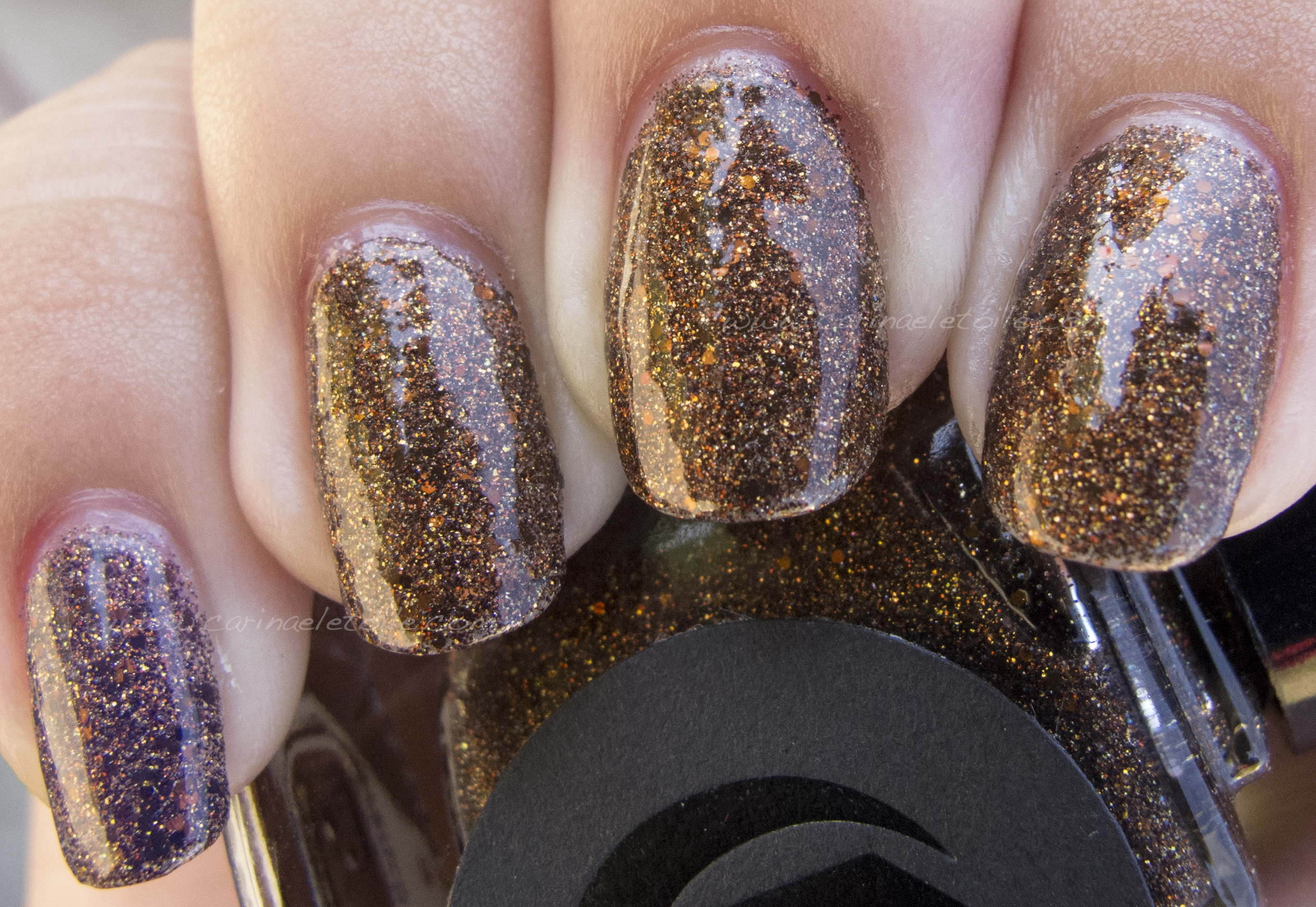Cirque French Roast is described on the site as “A sparkling bronze glitter polish that reflects gold and copper”.