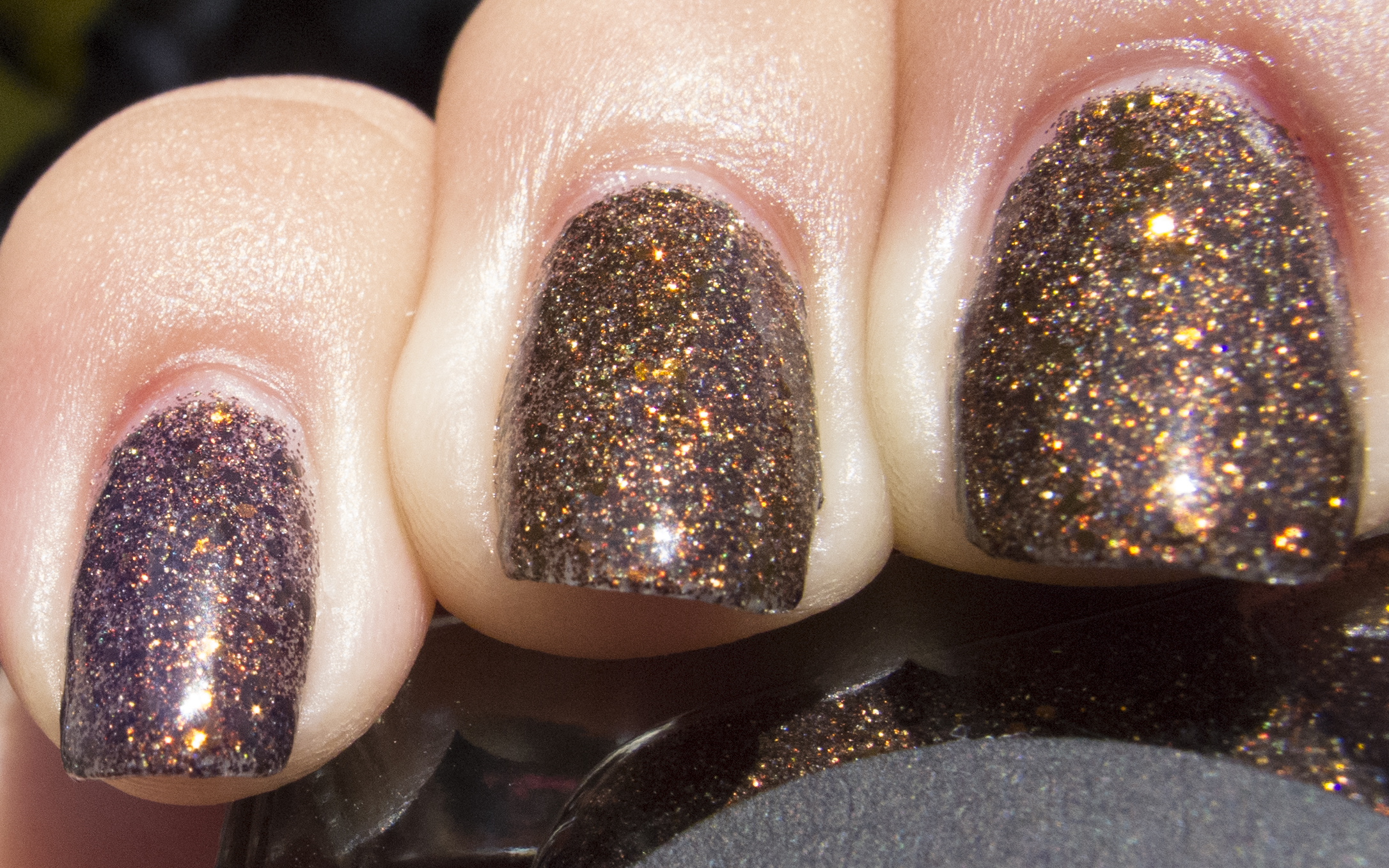 Before you do, let me say a few things about Cirque French Roast – this is an absolutely gorgeous color that can be worn alone or layered on top of a darker color. I used three coats and it was opaque and quick drying. That took me by surprise because sometimes glitters can take forever and a day to dry. Not this one!