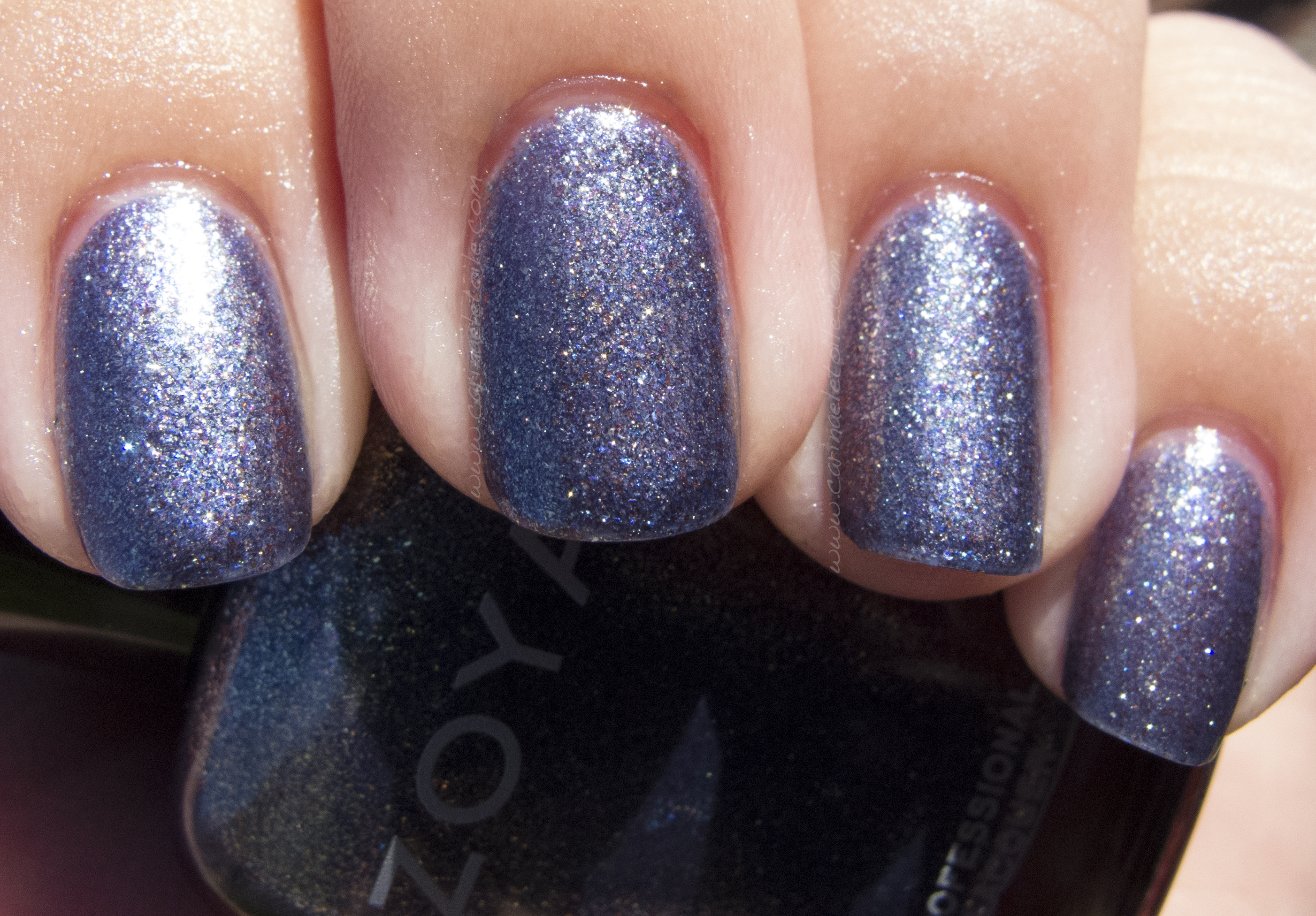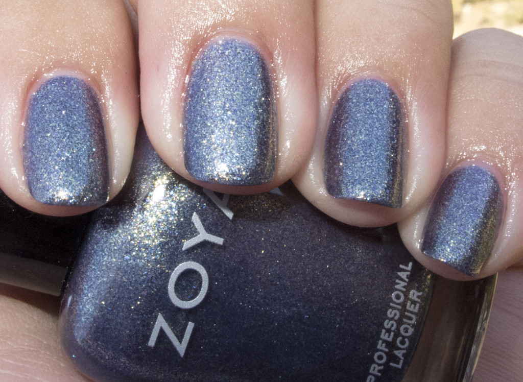 Zoya Feifei is described as “A medium steel blue base with heavy gold, blue and pink iridescent metallic sparkle. A truly unique sparkling iridescent blue that adds a magical look to the nails.”