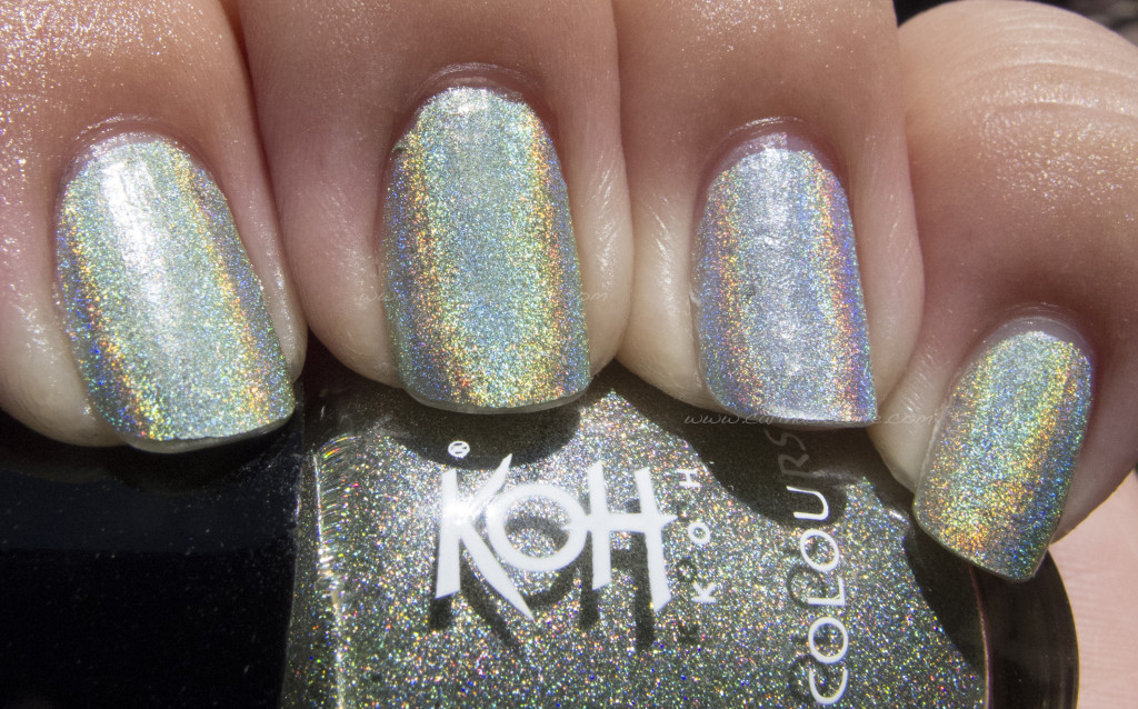 I used two coats over NFU Oh’s Aqua Base – that definitely helped tame Koh Metallic Green in a way that I didn’t expect. Actually, Aqua Base really tamed a lot of my holographic polishes that I had deemed moody and temperamental.