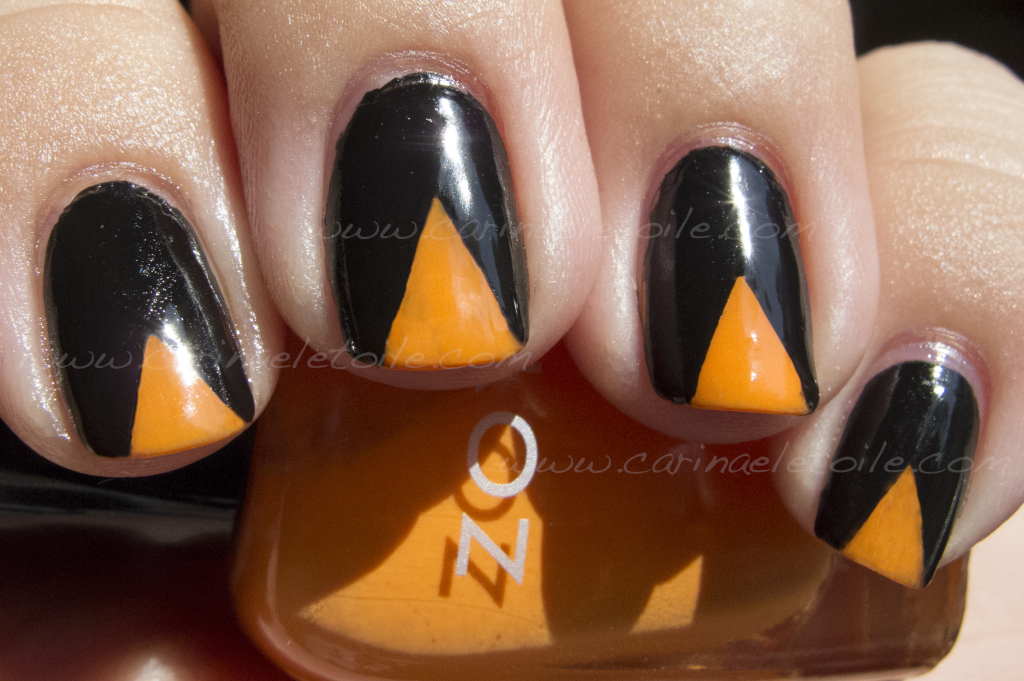 This manicure was easy to do – did 2 coats of Zoya Jancyn, waited a minute for it to dry and then put on my quick drying top coat. Waited 5 minutes and then put down my tape on my nail that I had cut into a square. Placed it on the tip and did one coat of Sation’s black nail polish. Waited a few seconds, maybe closer to a minute. Carefully removed the tape and there ya go – the square! I thought waiting a couple of minutes for the black polish to dry would be enough…it wasn’t. 🙁 There were streaks in 3 out of the four nails. I ended up trying to ‘shop it out and well…I didn’t do a very good job. However, on the ring finger you can see no streaks – I had let 20 minutes pass on that nail for some reason. I remembered and slapped on the fast drying top coat – that’s why you won’t see any black streaks on part of the orange in this manicure.
