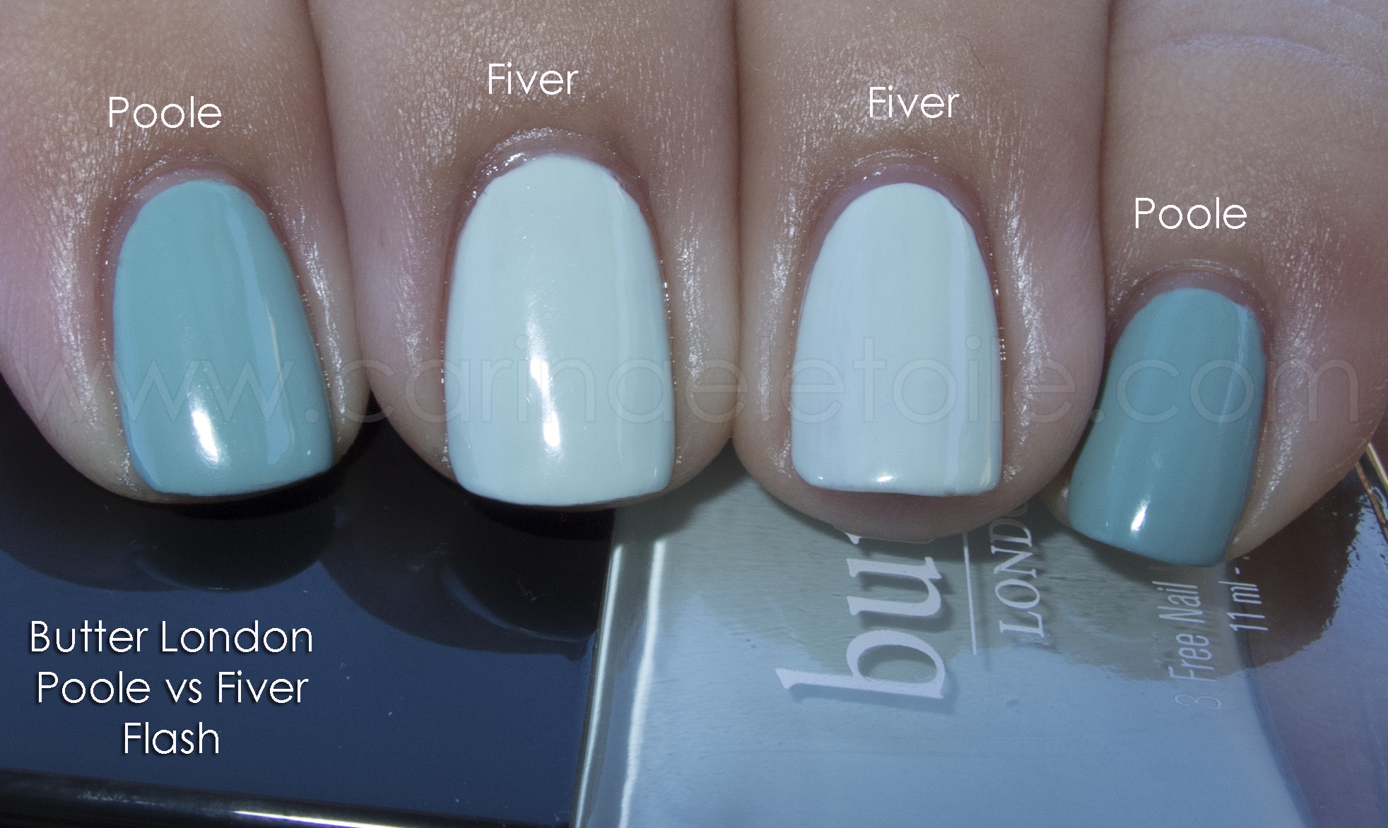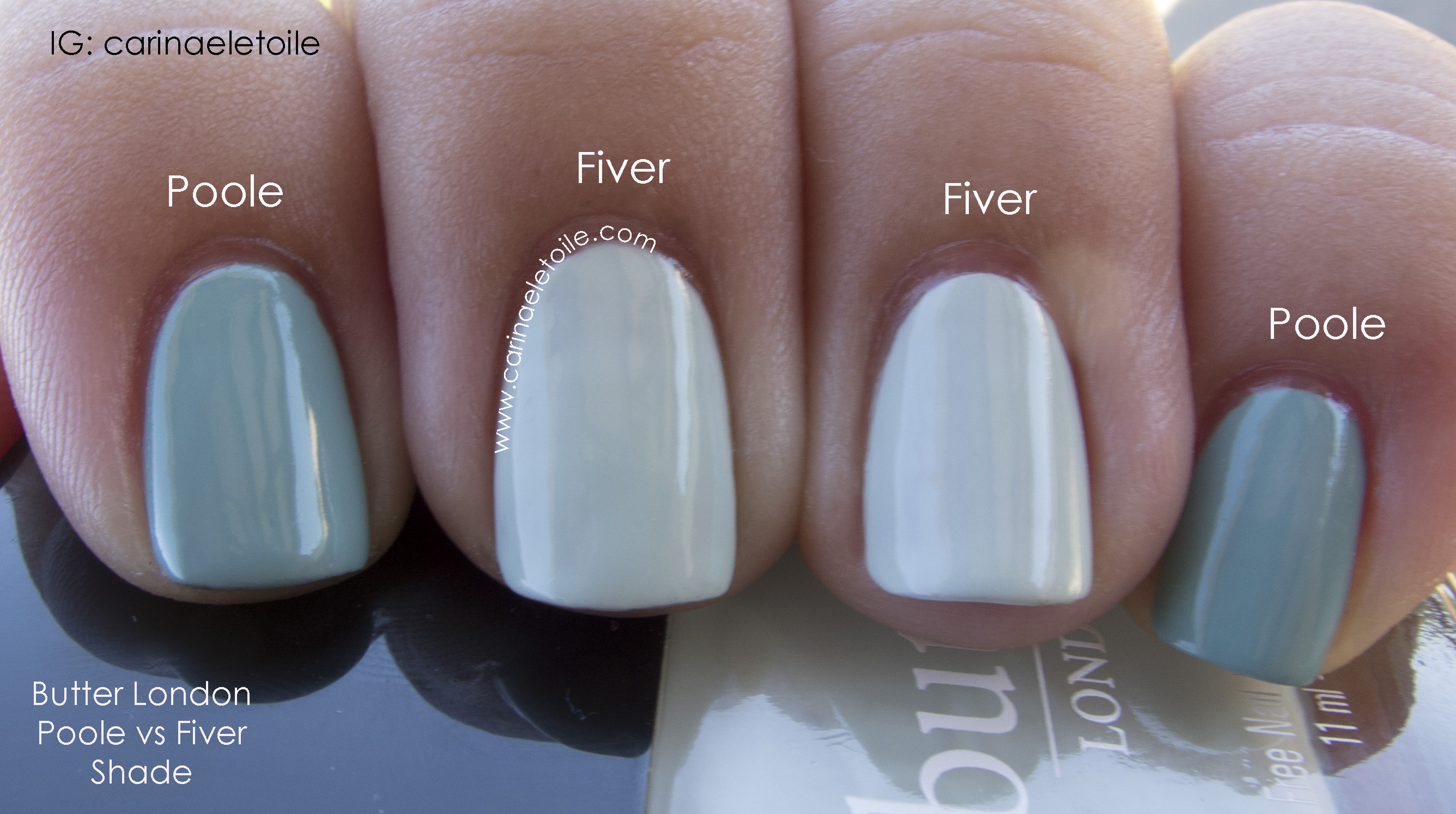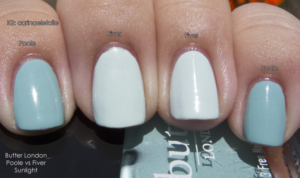 On the site, Butter London Poole is “A robin’s egg blue crème inspired by this seaside resort town in high summer.“, where as Butter London Fiver is “Opaque, mint-green crème.”