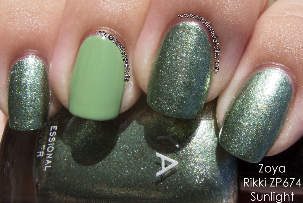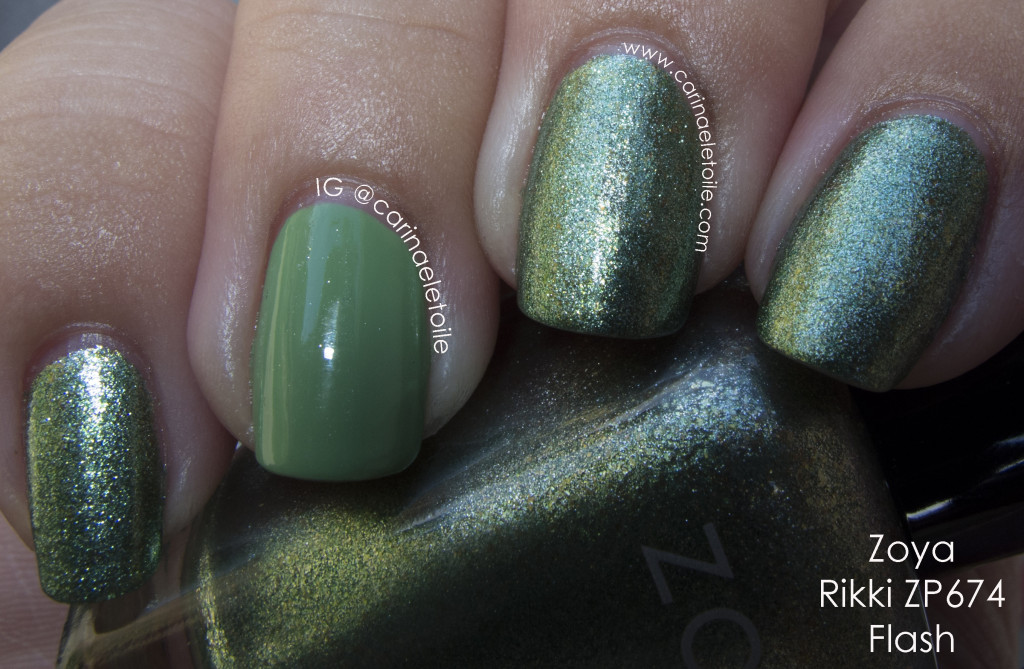 I love how the flash almost makes Zoya Rikka a Kelly-green, but not quite. You can’t really see the gold flecks in here, but the silver comes into prominent play.