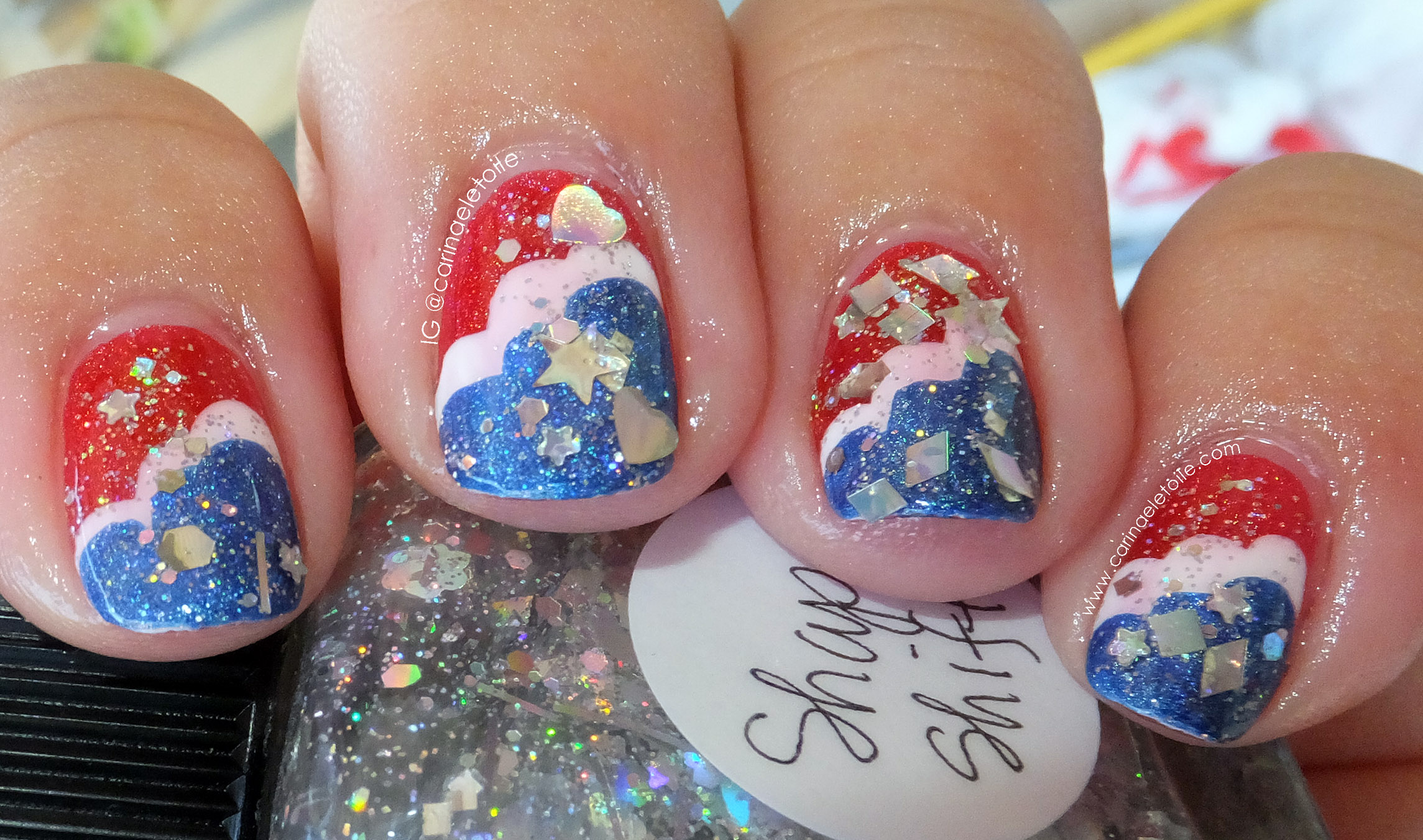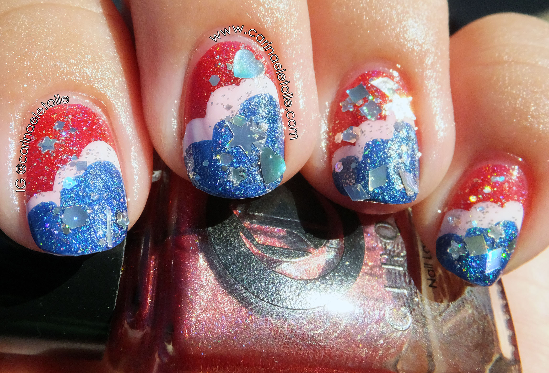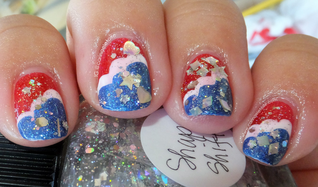 The colors used were Cirque’s Vesuvius (red) and Bejeweled (blue). The white was Cult Nails Tempest and the glitter was Lynnderella Shape Shifter. Bummer you couldn’t see the crazy holographic polish that came into play with Vesuvius and Bejeweled. However, you will be able to see them when I feature them next week. Maybe this weekend if I have a chance to process them! They truly are beauties to behold.