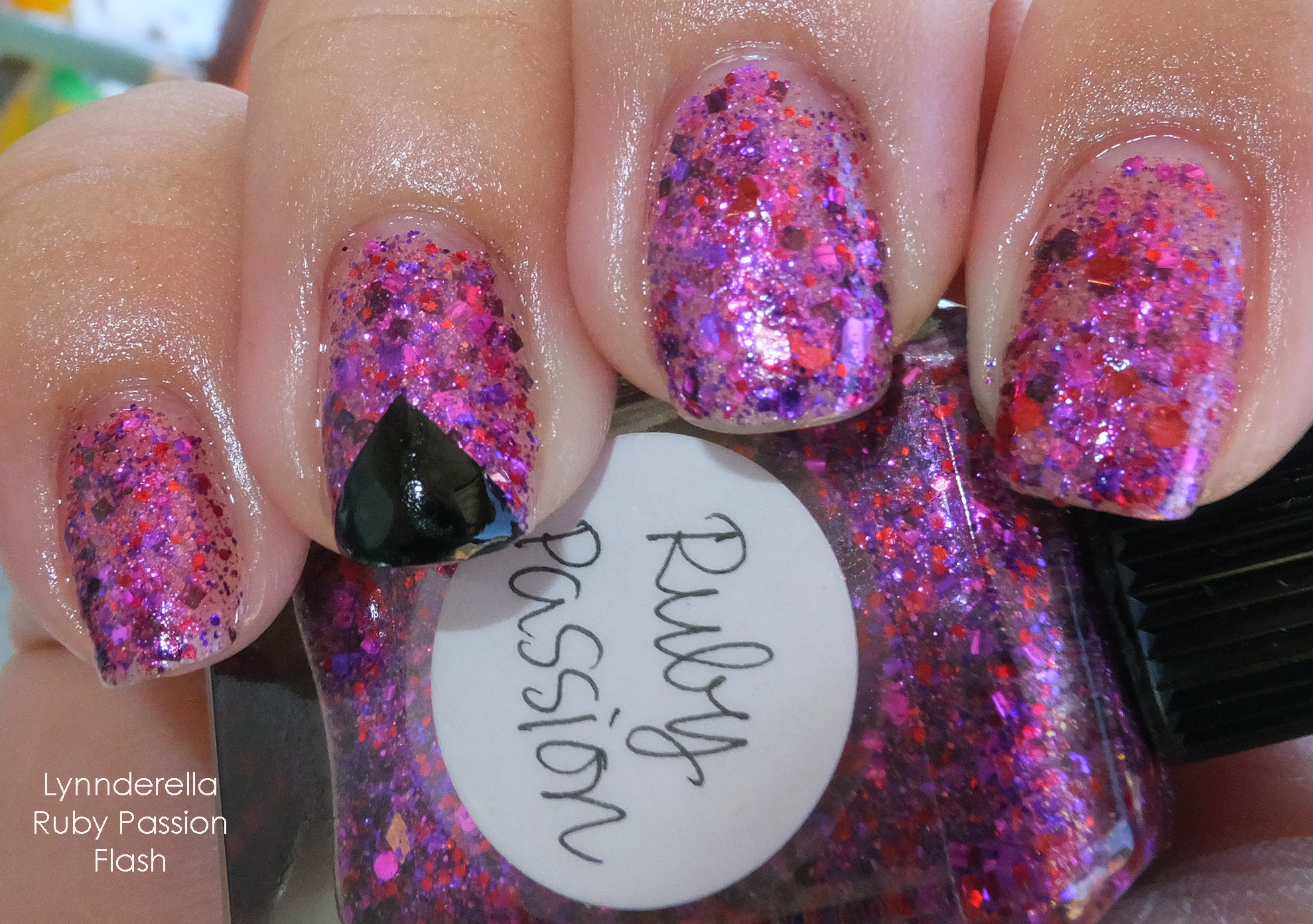 I did another version of this mani featuring Lynnderella Ruby Passion, but I got a bit lazy in editing and decided that I really preferred the set below much more so than the other set. I may pull out a pic from the other ones where the glitter peeks out from under the black polish. It’s actually quite pretty, but I wanted to really showcase the glitter here. Hence, the other set was not shown.