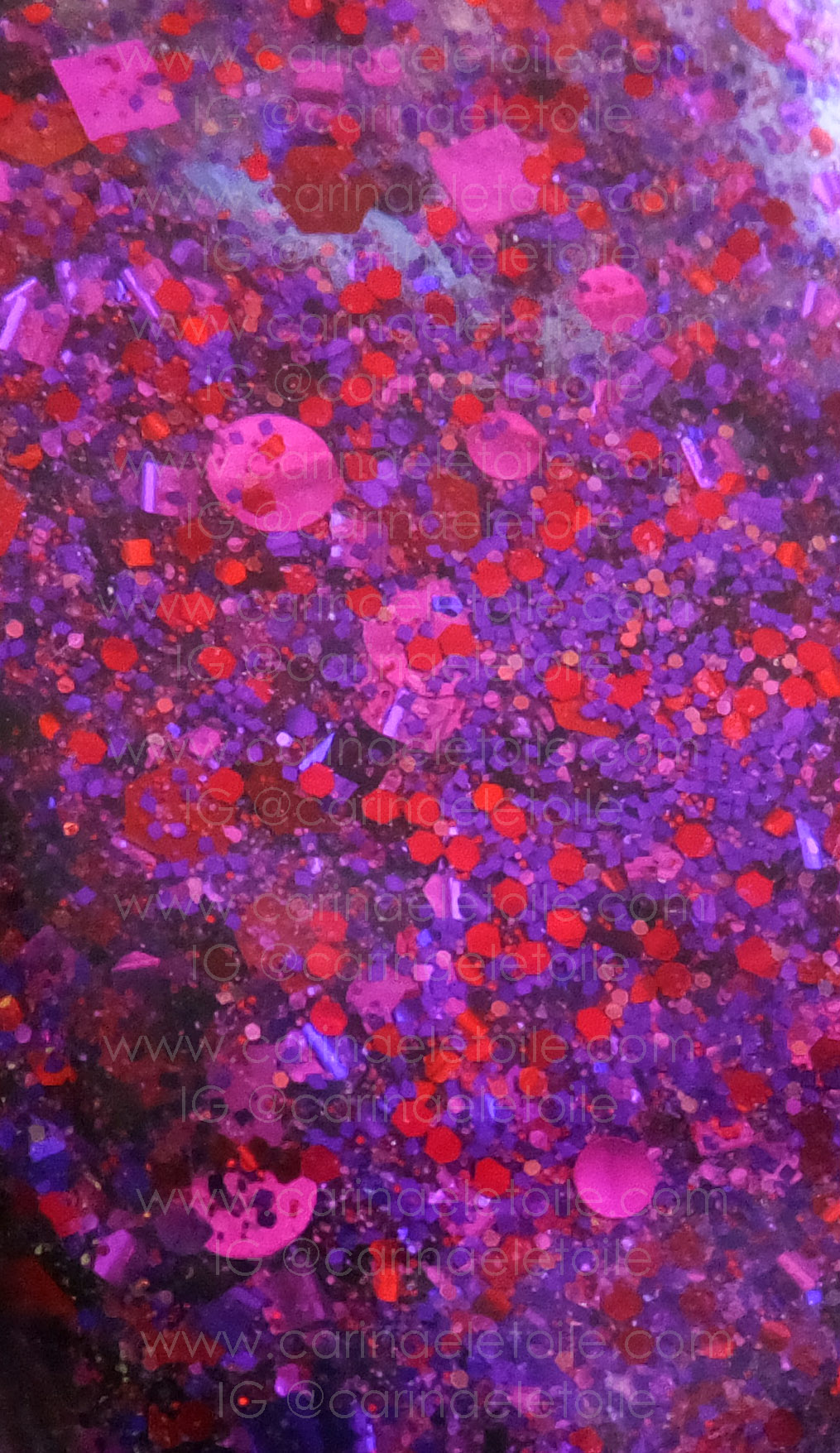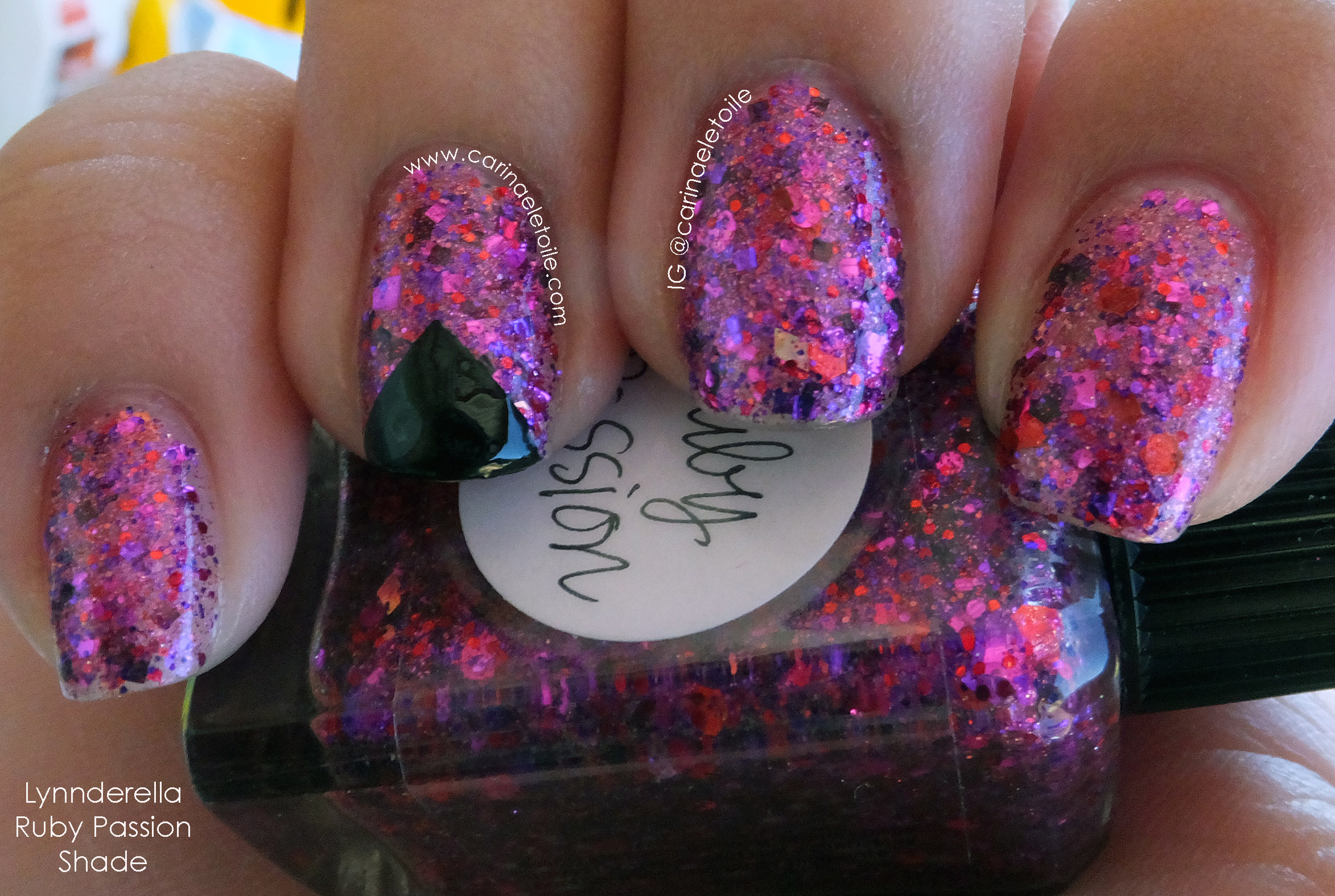 This glitter polish surprised me because usually Lynn’s glitters tend to be really heavy and thick on application, meaning that one or two coats will do. This one required three coats for good coverage. It ended up being lumpy and I had to use a few top coats to smooth it out. Well, smooth it out as best I could. However, I loved the color so much I kept piling on the coats. LOL