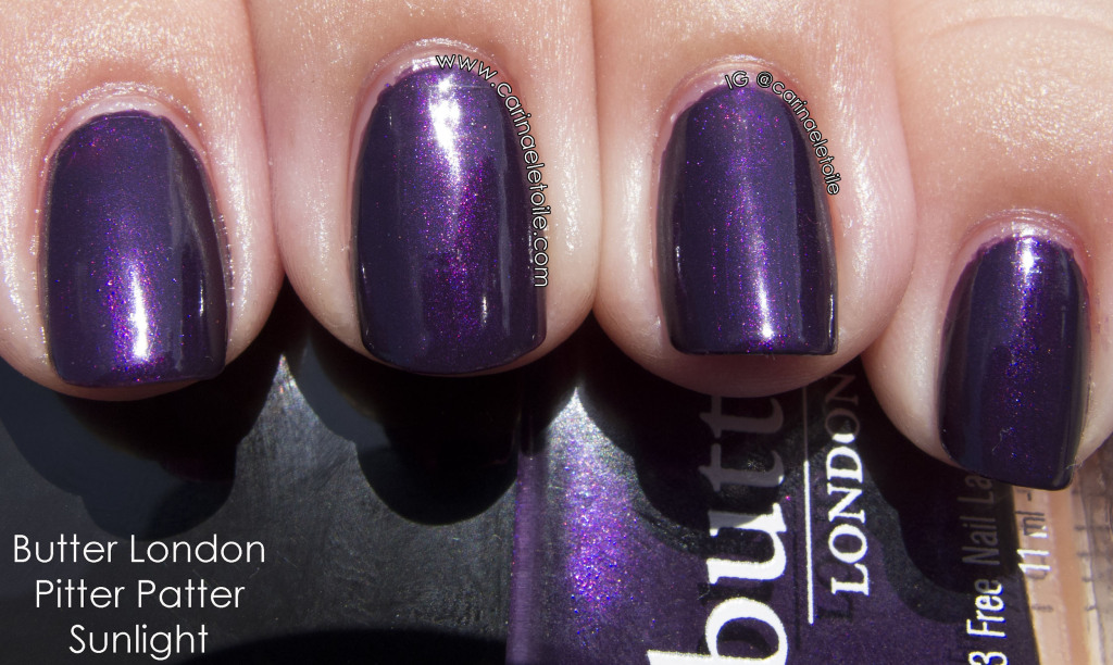 The shimmer really comes out here in the sun and it had red and purple. I had flashbacks to a color called Russian Navy, but with a purple base.