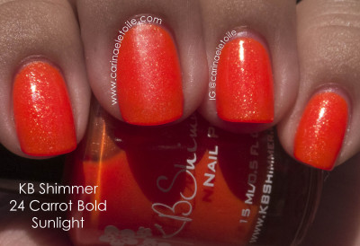 KB Shimmer 24 Carrot Bold is “…a red-orange polish that is a stunning summer color.  This orange polish has a gold micro flake that shines in the light.  This polish is super pigmented for coverage in two coats.” It is very pigmented and I found that one coat was very opaque, but while some may find one coat fine, two coats and it absolutely is a stunner.