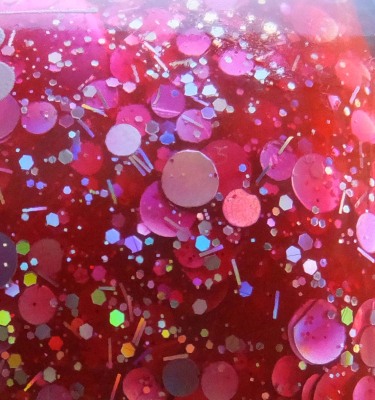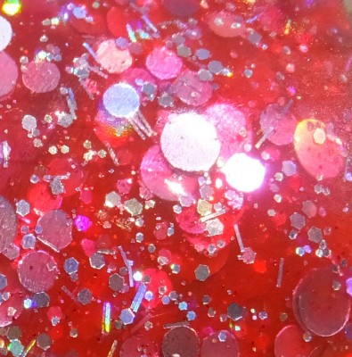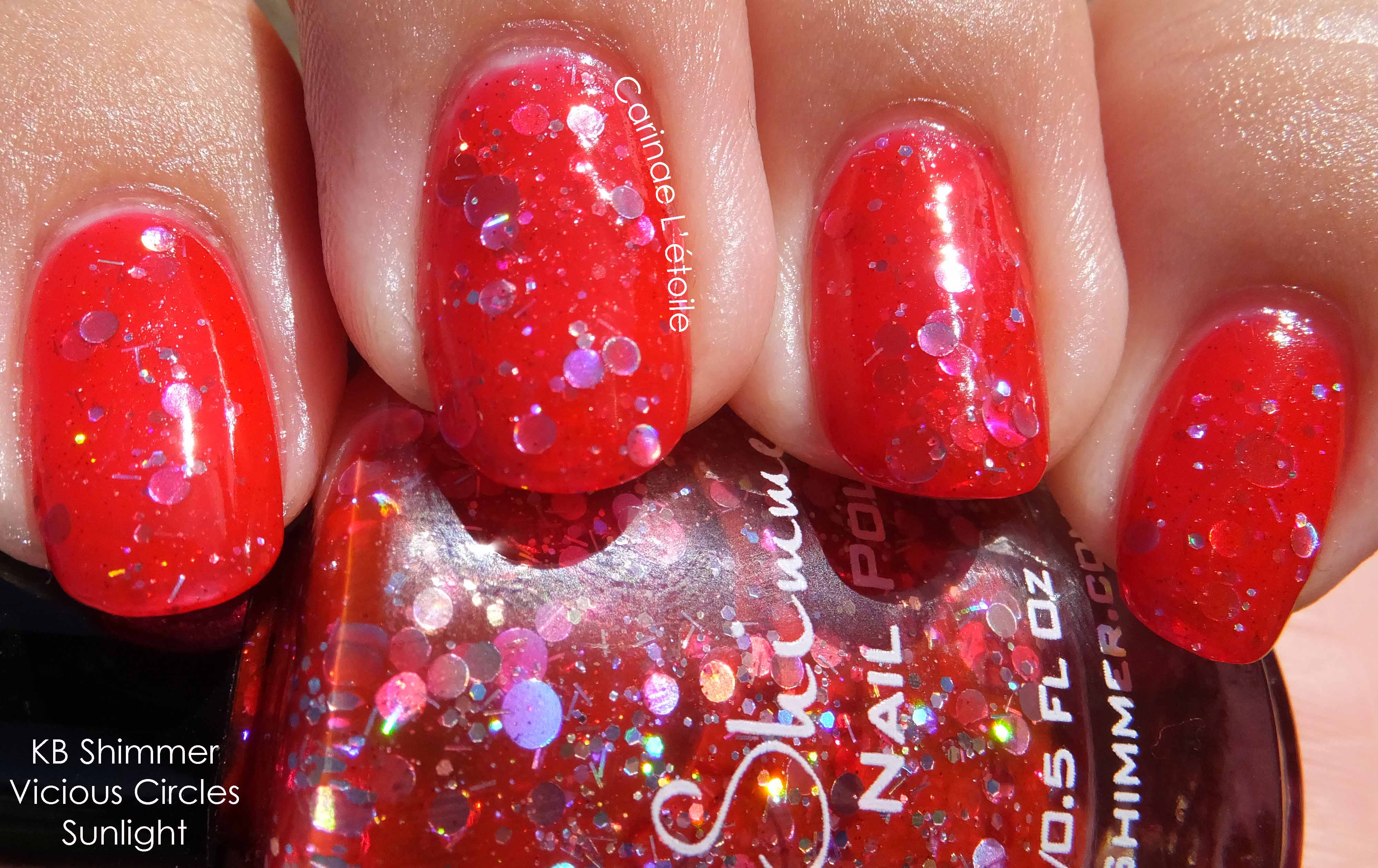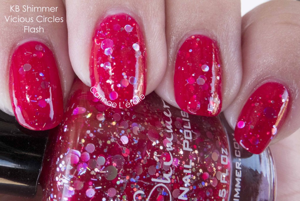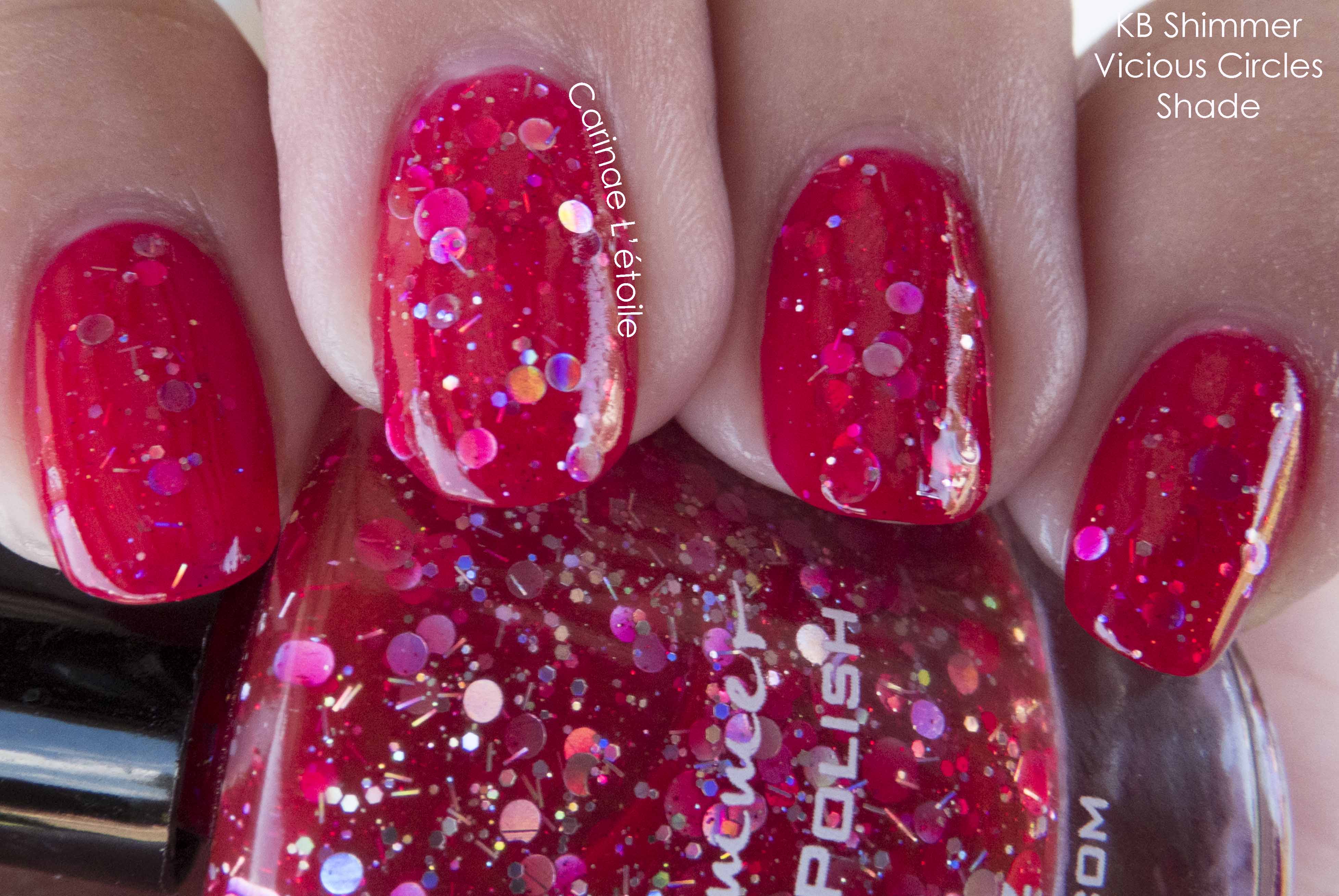 KB Shimmer Vicious Circles is described as “A blood red jelly loaded with silver holographic circles in two sizes, sliver holographic hex glitters and holographic sliver micro slices. This jelly polish works best in three thin coats, but those with shorter nails might get away with two.”
