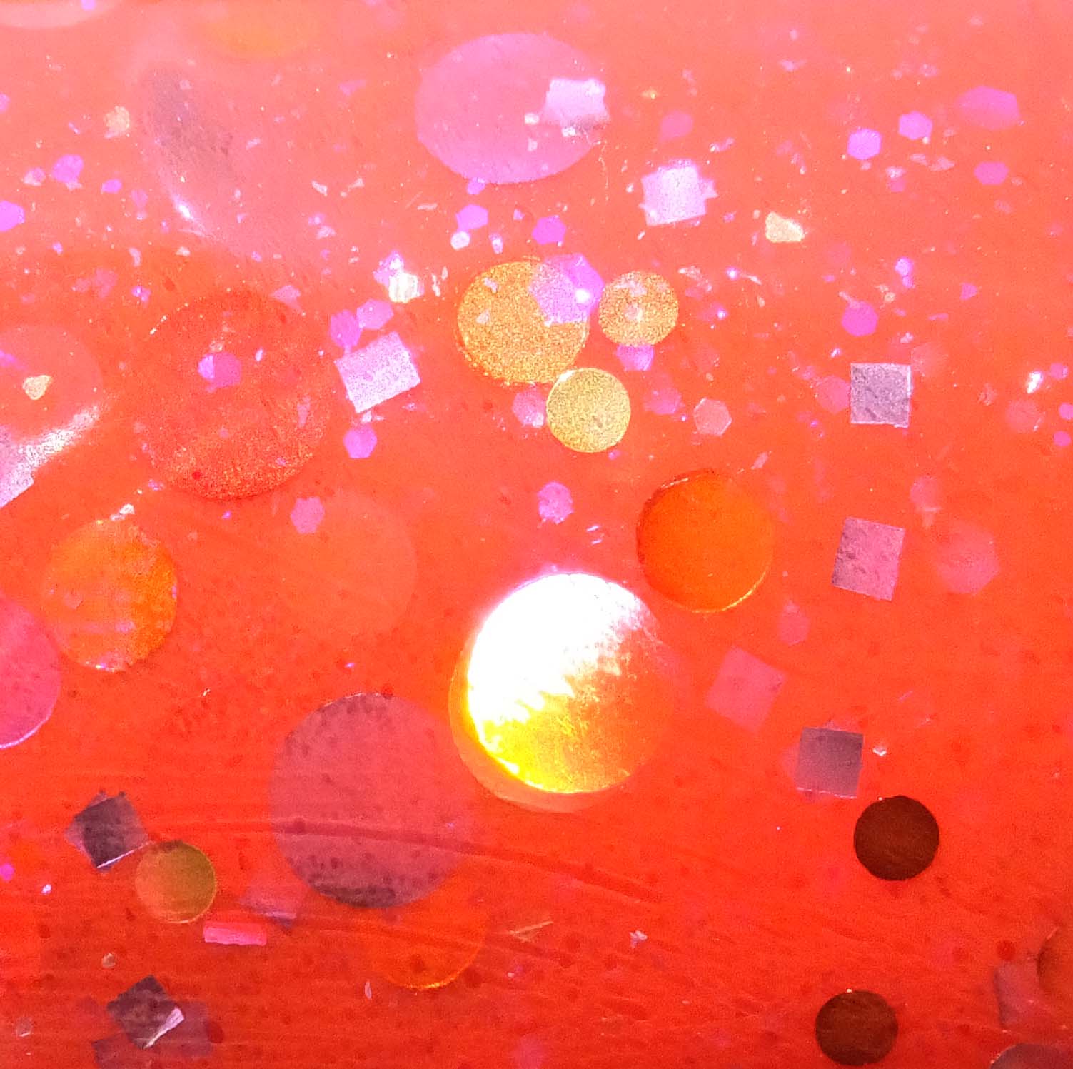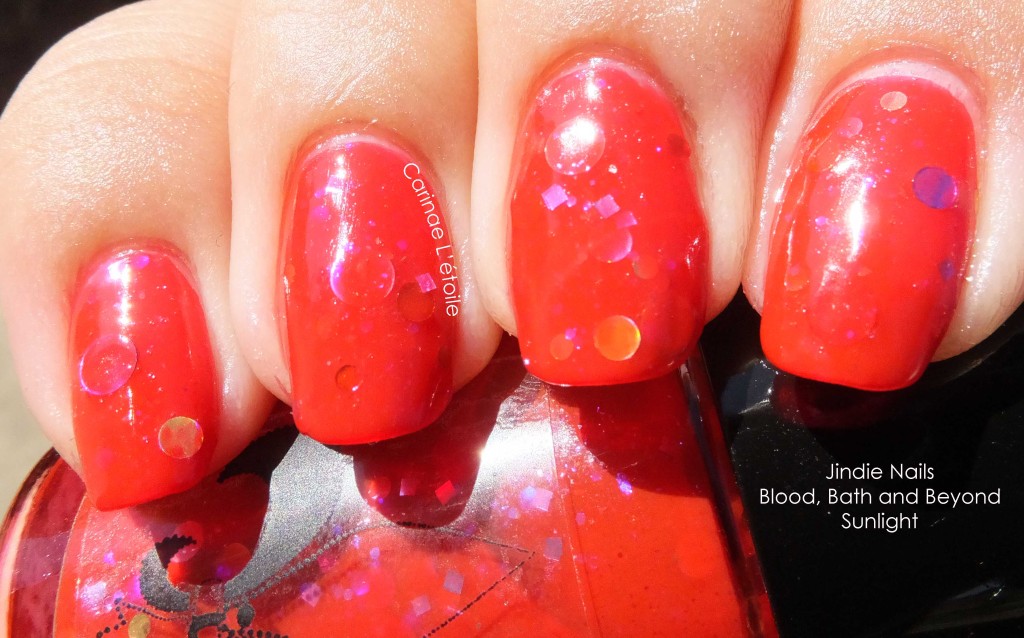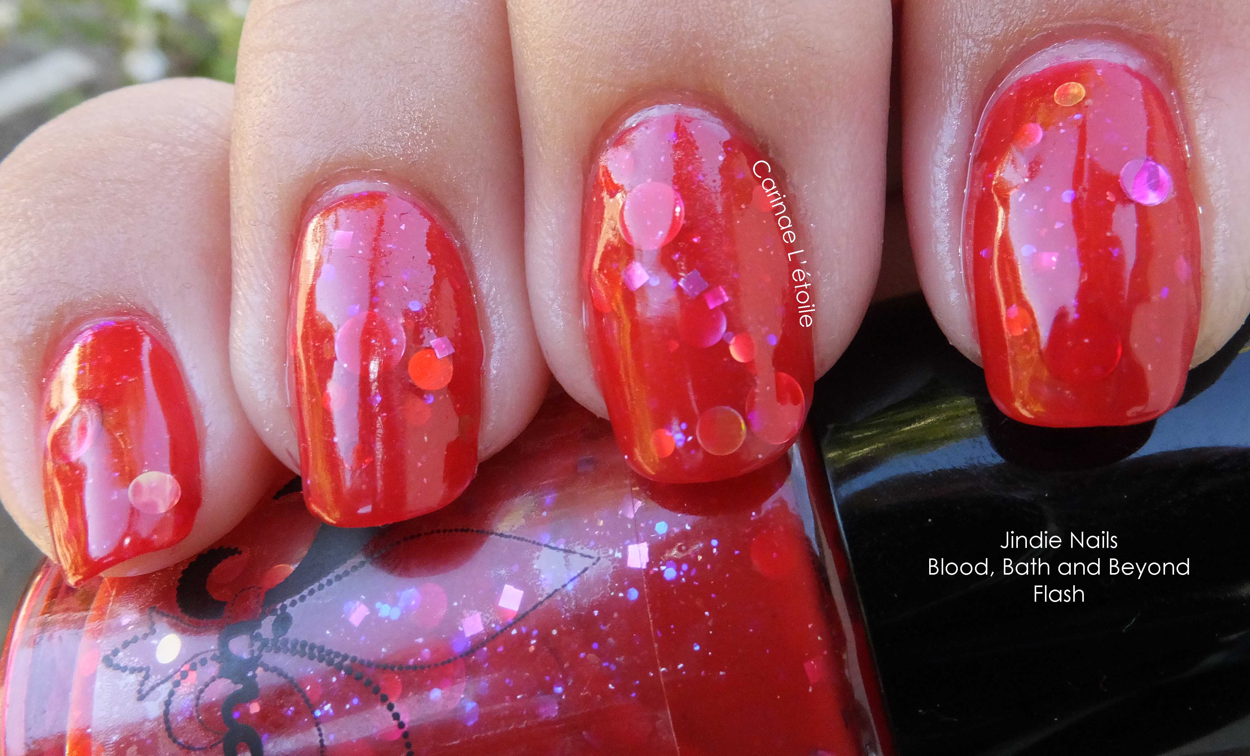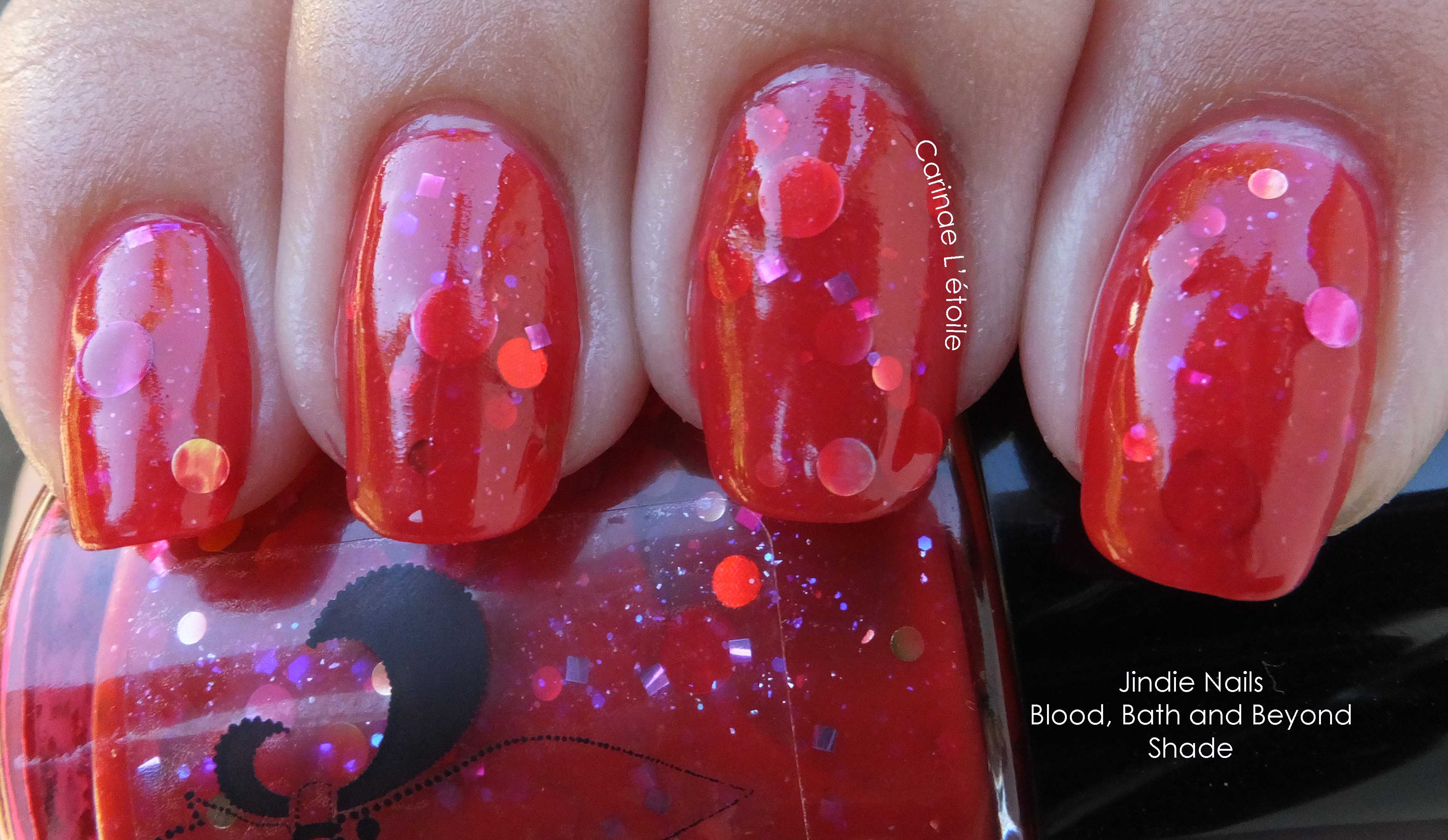 Jindie Nails Blood, Bath & Beyond is described on the site as “blood red jelly with intense violet/gold shimmer, lavender and violet metallic and holographic dots, gold metallic and holographic large, small and medium dots, red large, small and medium metallic dots and purple iridescent sparks throughout.”