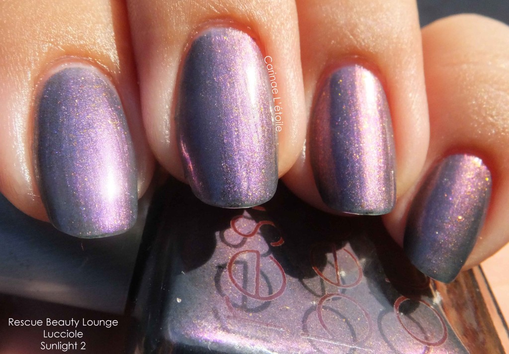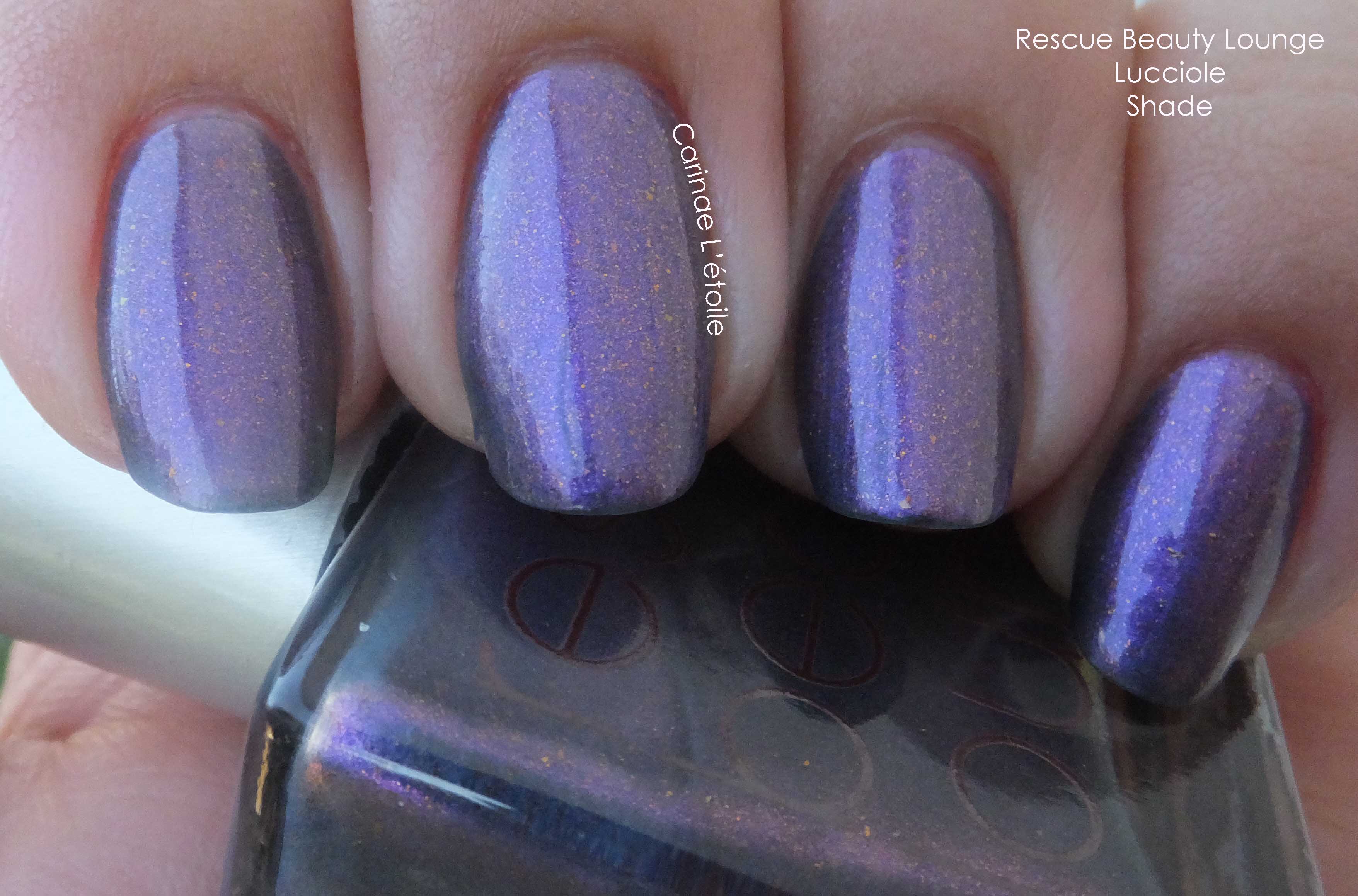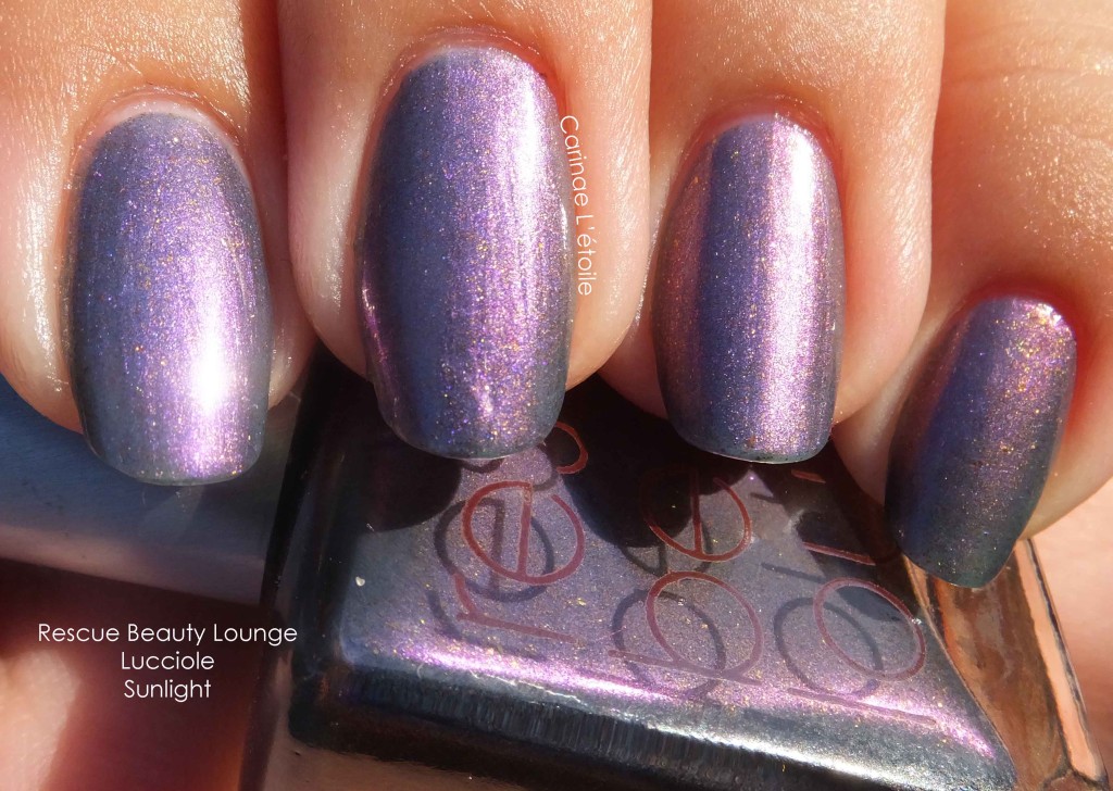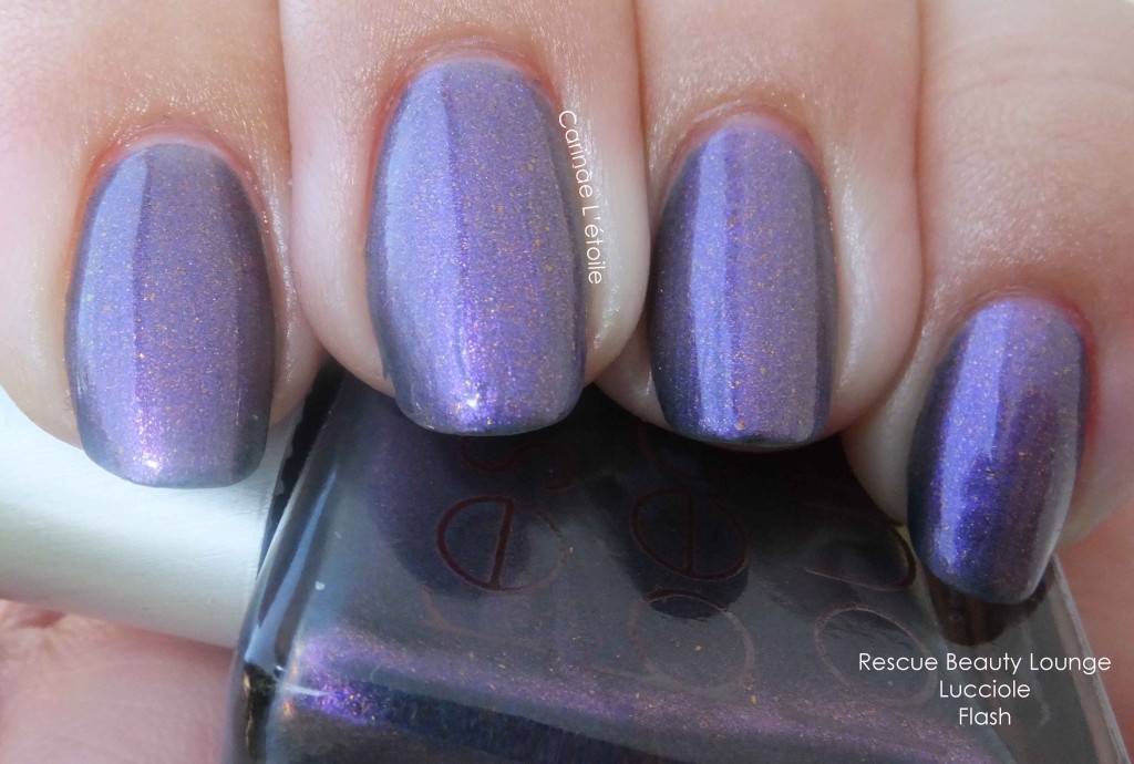 Rescue Beauty Lounge Lucciole“Or fireflies in Italian, remind me of the most magical time in my childhood when I was still innocent and the world was a safe and magical place. This color is reminiscent of the color of a deepening summer night sky after sundown, between dusk and midnight. In my mind’s eye, I see interspersed throughout this glorious base, random flecks of blue and/or green iridescent luminescent flecks (like the ones that are visible in Cuprum) that randomly sparkle when the light hits it, reminiscent of the fireflies’ sparks of light.” By Mindy.
