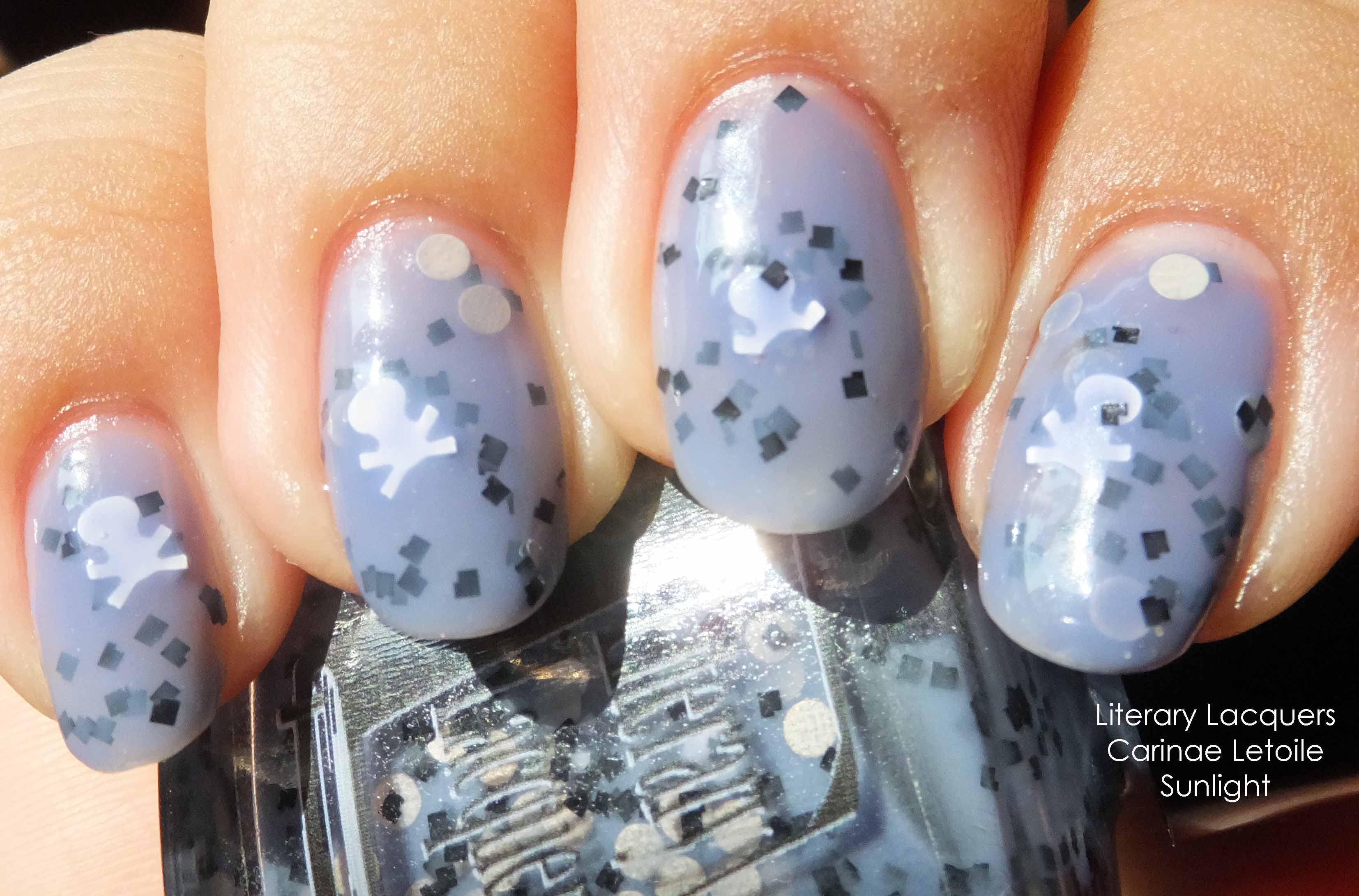 I wanted lavender again, but Amy suggested 2 colors that were close to lavender…they were also colors that I happened to love. The base for this color is Pantone 7452 C, which is a color that is extremely close to the lavender/purple on my blog. I requested white skull and cross bone glitter as well as grey matte glitter to have it all tie into my blog’s colors and theme. I think she’s captured it pretty well! Come and have a look – www.carinaeletoile.com