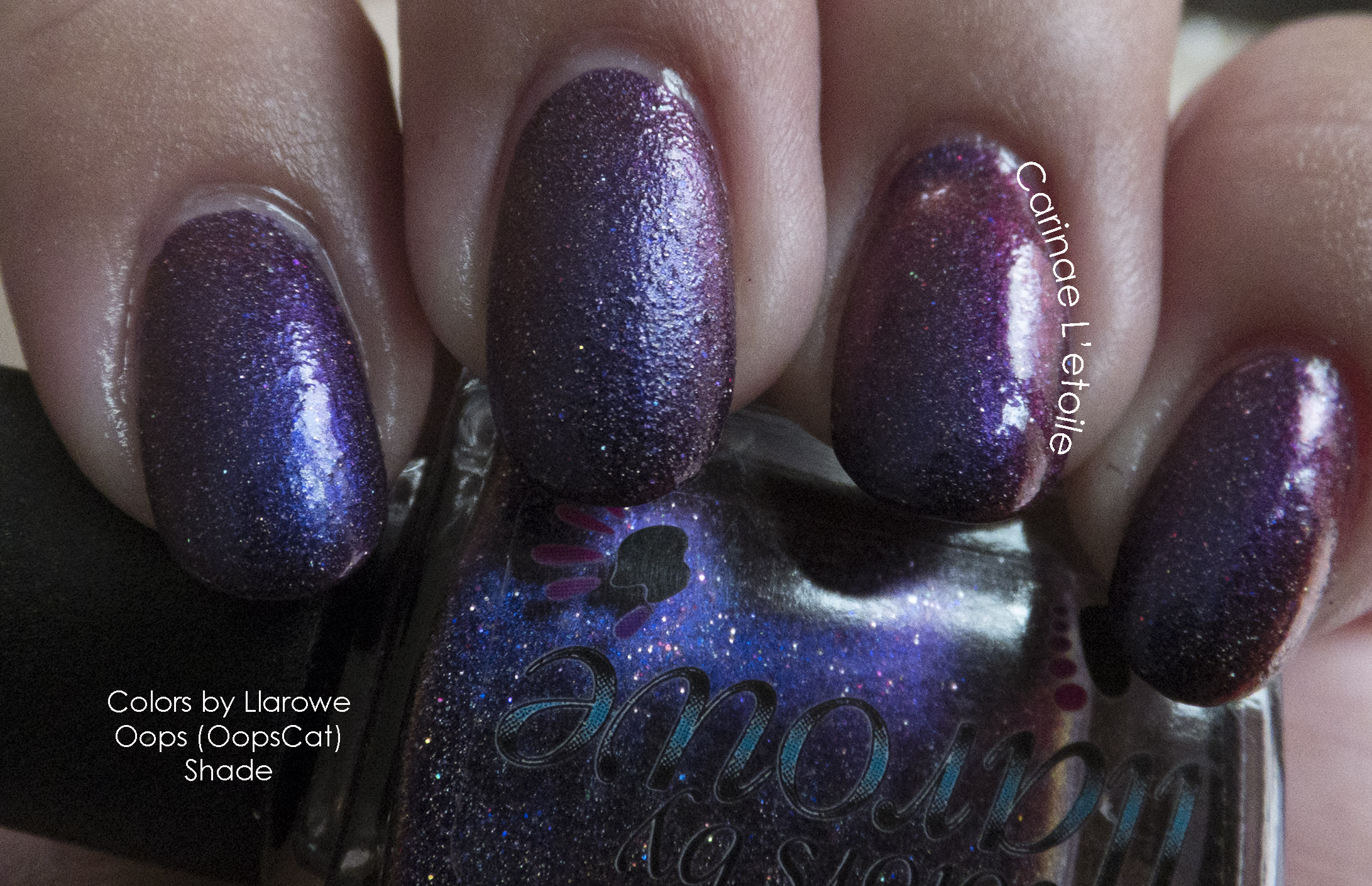 Colors by Llarowe Oops (Oopscat) is not one of my favorites, but it is certainly gorgeous. I left my middle finger without a top coat so you could see that it has a semi-matte sort of textural feel. However, once there is a top coat, this bad baby really shines. Duo-chrome goodness…what do you think?