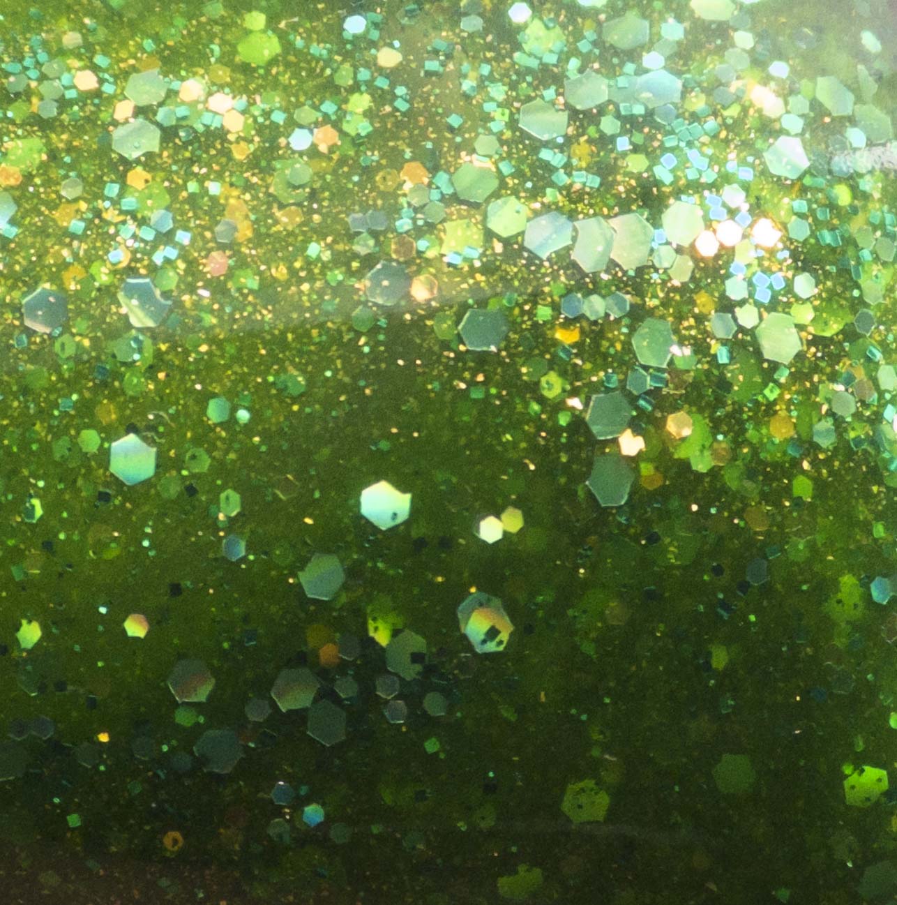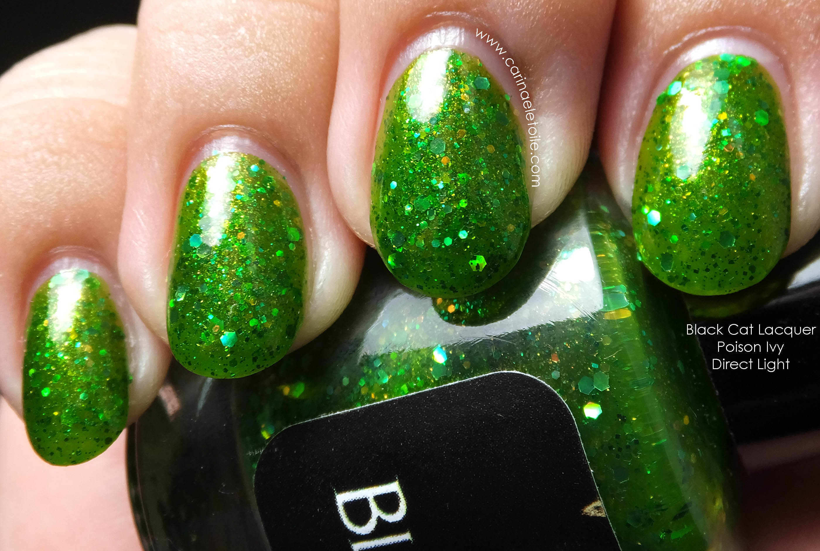 First up is Black Cat Lacquer’s Poison Ivy. It’s a gorgeous and lush grass green crelly base with gold glitter and multi-sized green gliter. I used three coats and while it took a bit longer to dry, I found I was most happy with this color out of the others in the box. This crelly is buildable and I wanted to see how dark I could get it, hence the three coats. Top coat (Glisten & Glow’s Fast Drying Top Coat, to boot!) showcased the true beauty of this color.