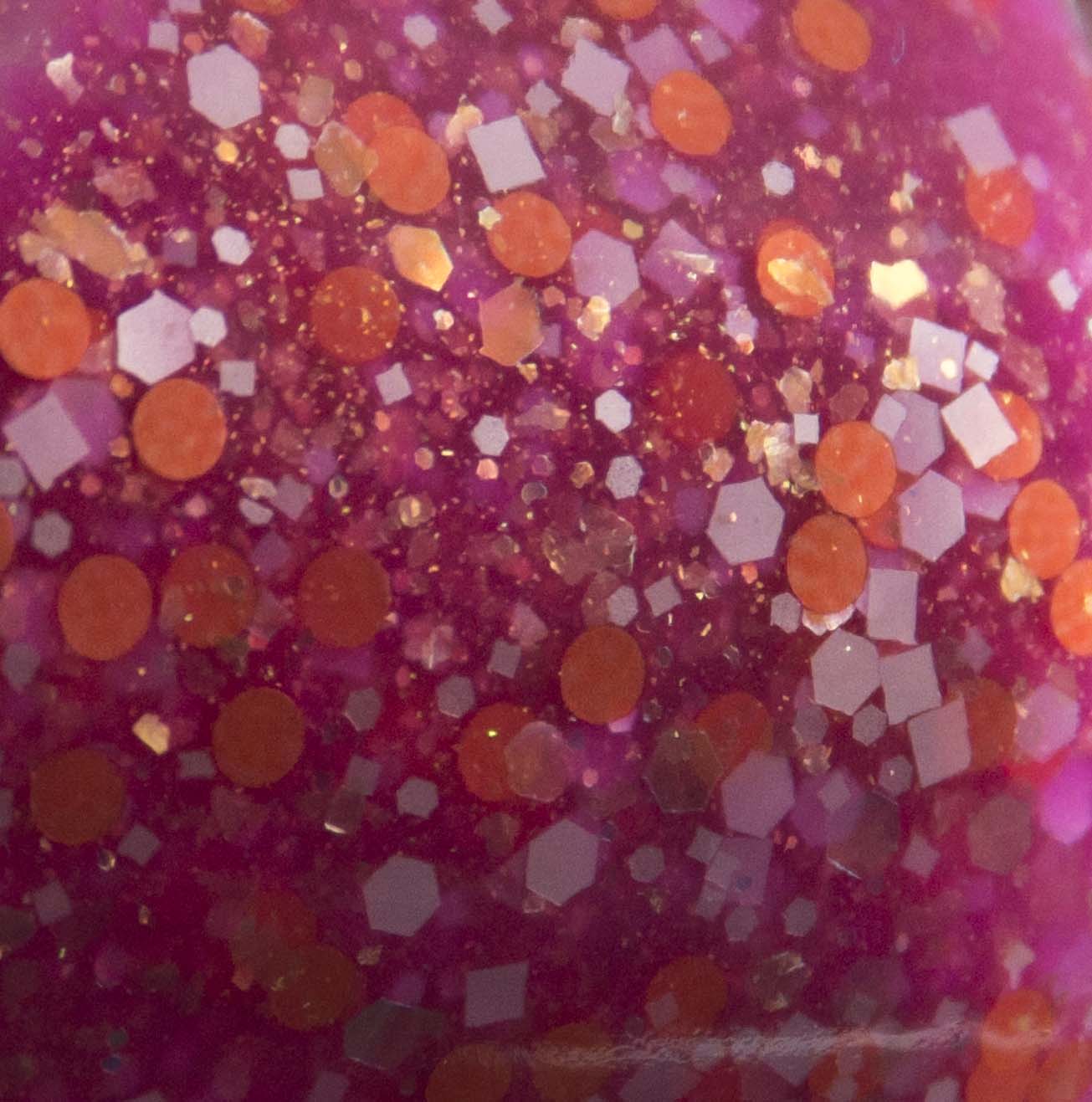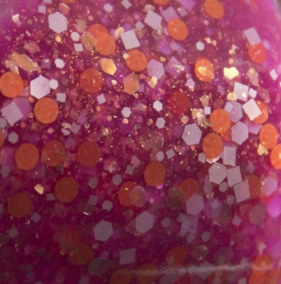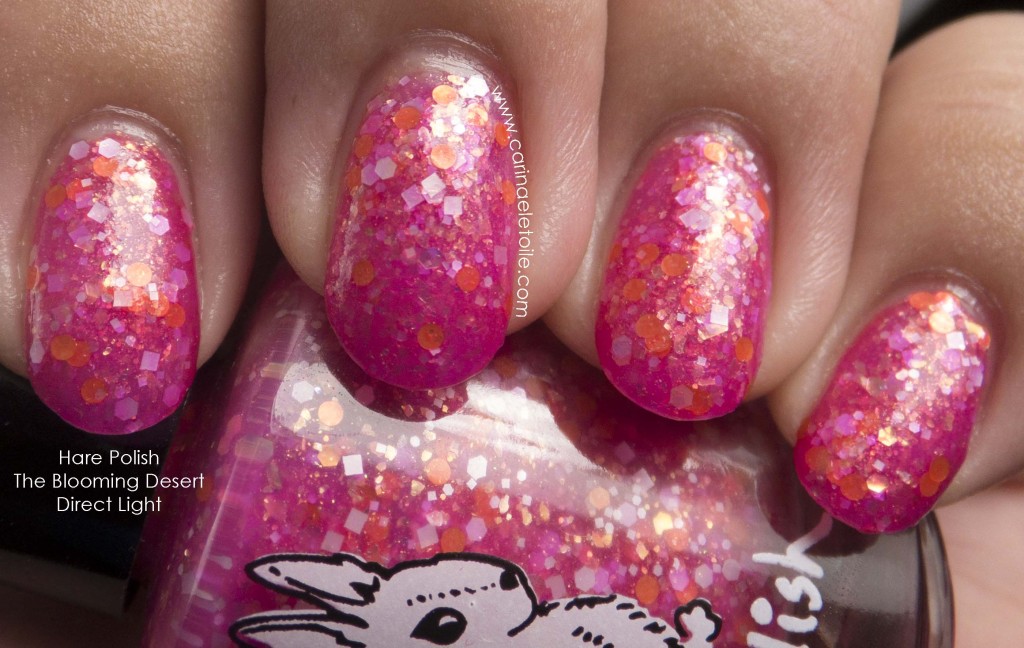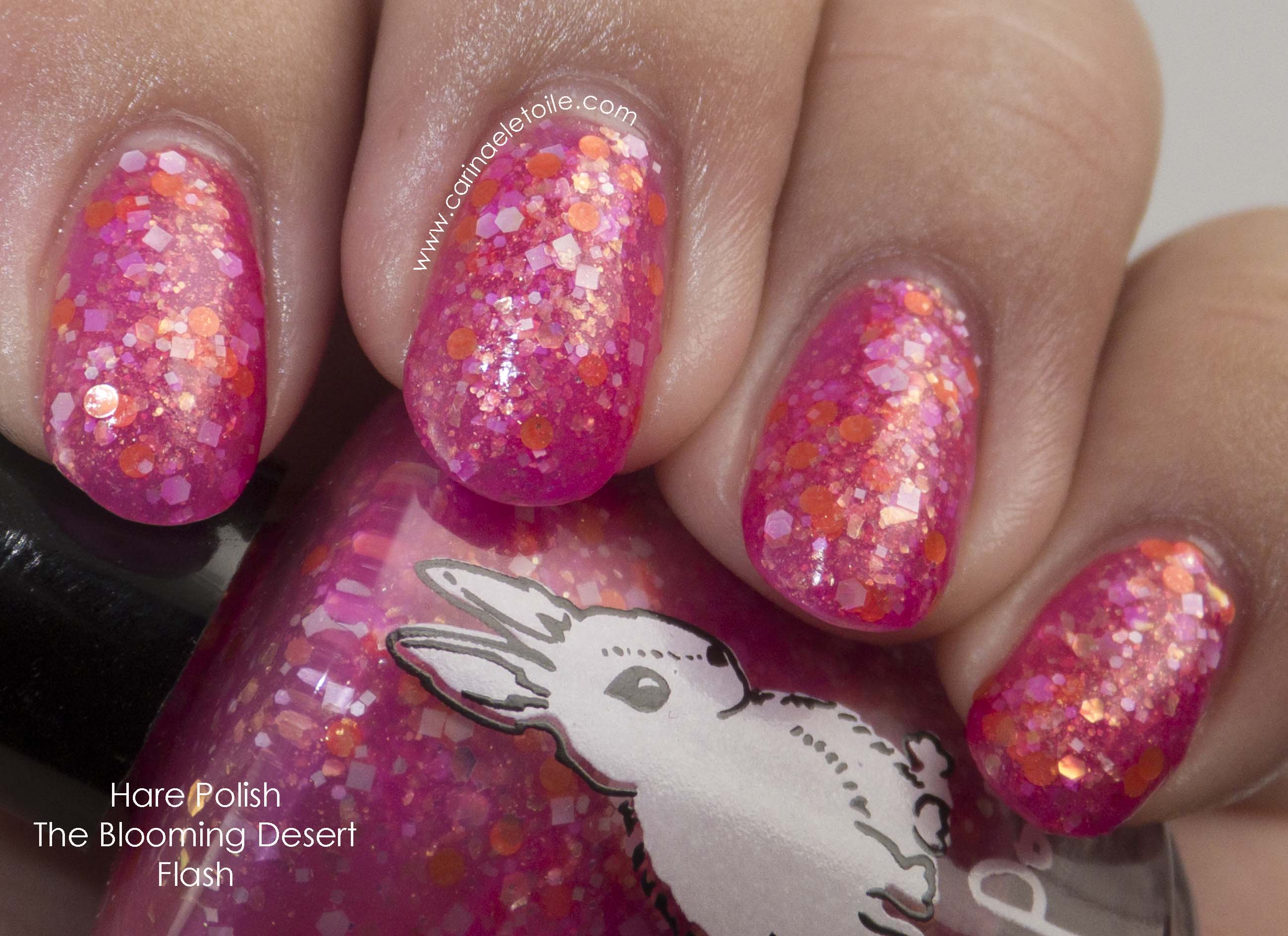Last, but not least in the polishes was Hare Polish’s The Blooming Desert. According to a post by Hare Polish, “The Blooming Desert is a bright pink jelly with orange dots, pearly white hexes and squares, glowing gold iridescent glitter and gold flakies. It also features gorgeous golden shimmer!“