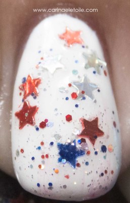 I normally shy away from patriotic glitters, but this really caught my eye for some reason. It was simple and understated. What? A simple and understated glitter? Ok, it has red, white and blue stars and red, white and blue regular glitter. It stands out, but it’s not mega blingy like some glitters. I had to get this. I decided to use KB Shimmer Red, White & Blue-tiful in a patriotic mani and played along with the whole colors of the American Flag thing. I normally don’t get patriotic glitters, but when I started digging around in my stash last year, I discovered I was missing them. I realized that I couldn’t quite do things I wanted to do. Yes, I had red, white and blue polish, but something about patriotic glitter just rounds out some patriotic manis. I think KB Shimmer Red White & Blue-tiful did a beautiful job on this mani, wouldn’t you agree?