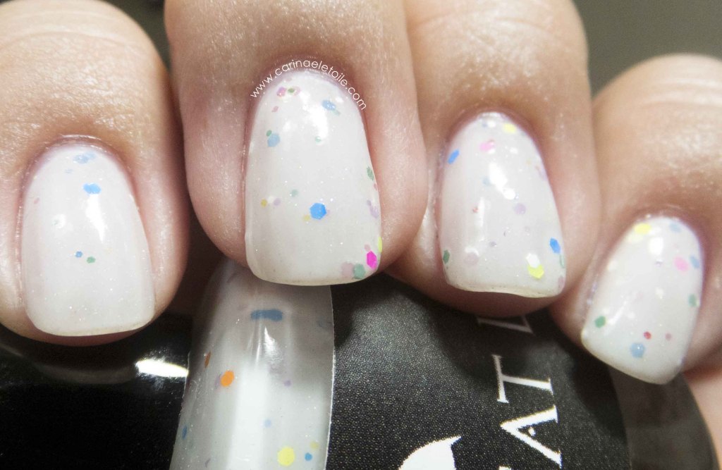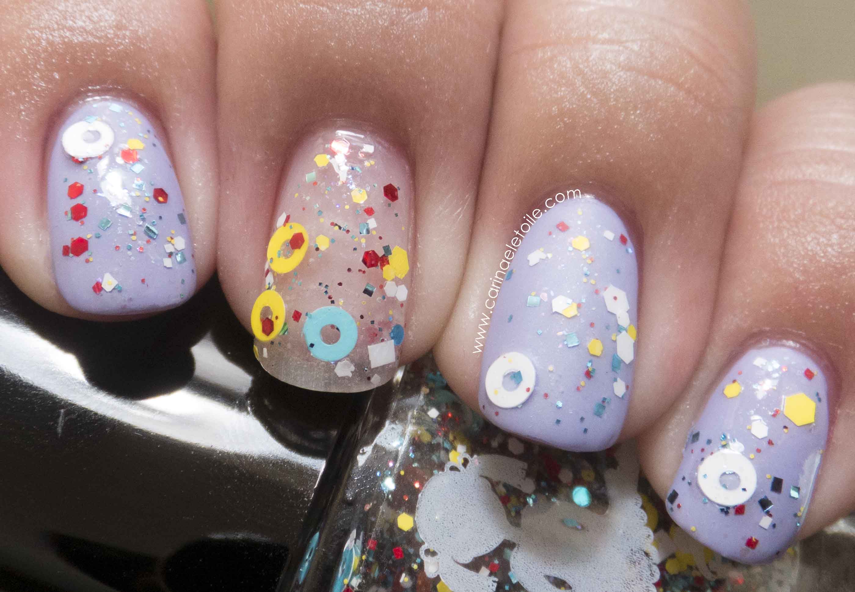 Dollish Polish This Ring Toss Is Rigged is layered over the Elevation Polish that was part of Llarowe A Box Indied for July 2014. I love Dollish Polish This Ring Toss Is Rigged because there are large chunks of circular glitter with holes punched out! Throw in some other shaped glitter in varying sizes in a clear base and what do you have? A fun polish that embodies its name.