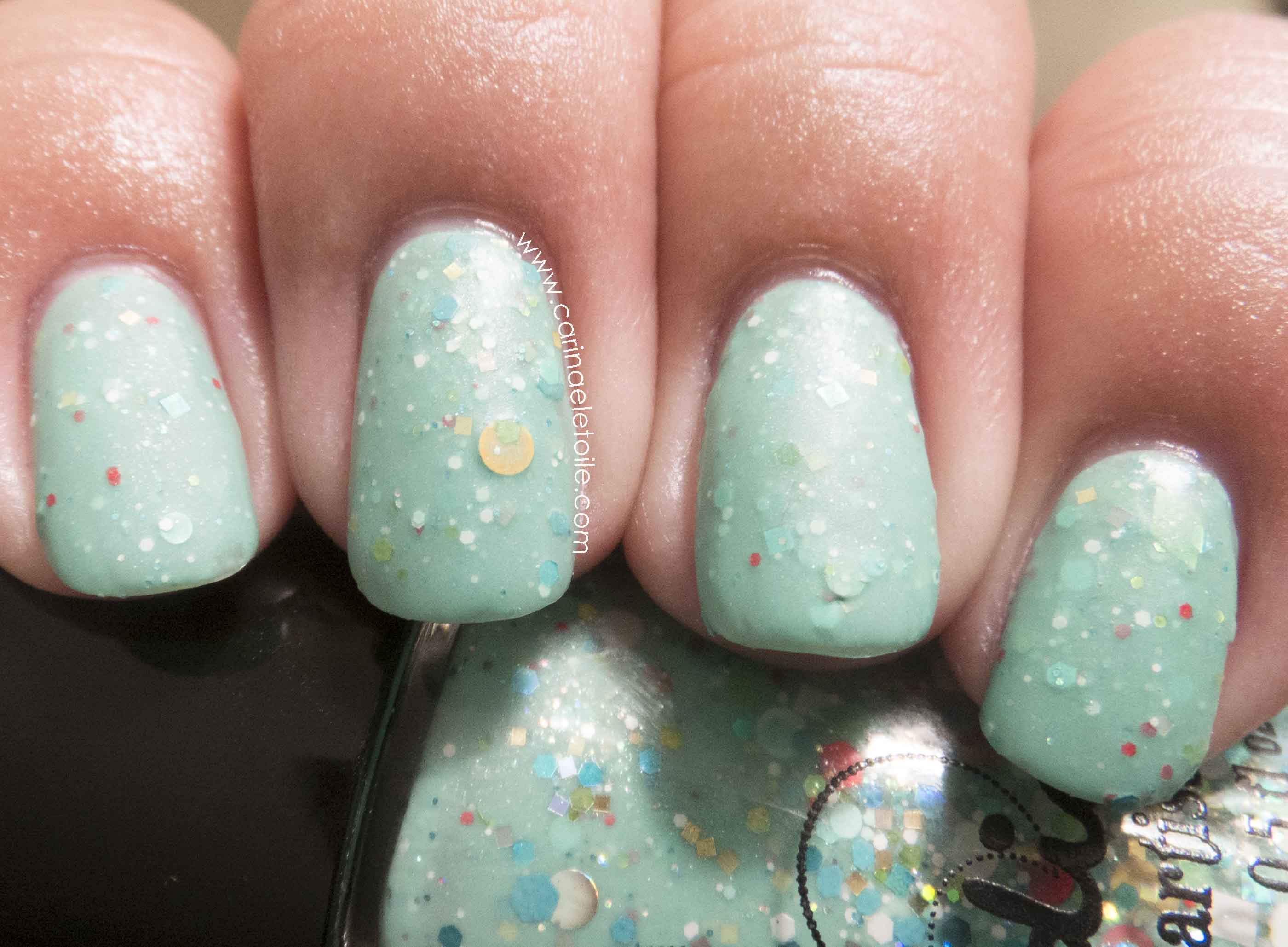 Jindie Nails Freaks At the Fair is a wonderful minty colored green creme base with pastel glitter in various shapes. My favorite glitter in it is the blue. I’m a huge fan of blue and green combinations.