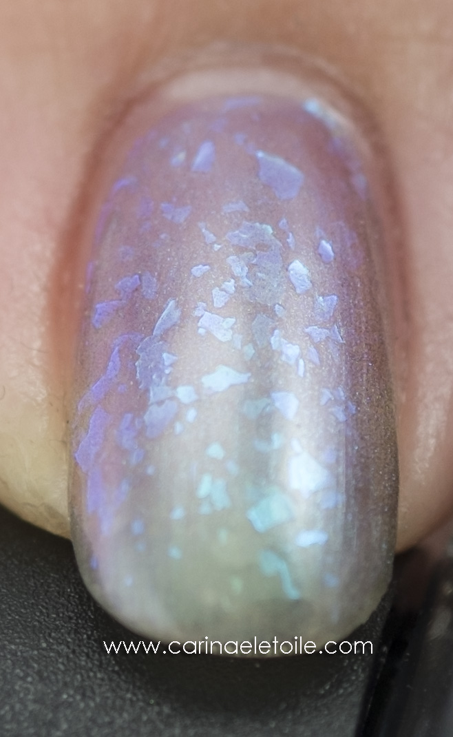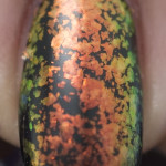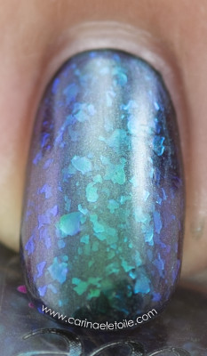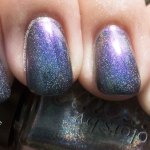 Colors by Llarowe Donna is described on the website as “Green/gold/purple/pink multi chrome sheer based blue to green flake. Â Can be built to opacity in 3-4 coats for a completely different look.” I think this polish has a lot more going on than what the description says. The bonus (aside from the overall beauty of the polish) is that it dries quickly. I do mean quickly. It dries in under five minutes and layers quite well. For me, the base looked like it had a charcoal tint. What do you think?