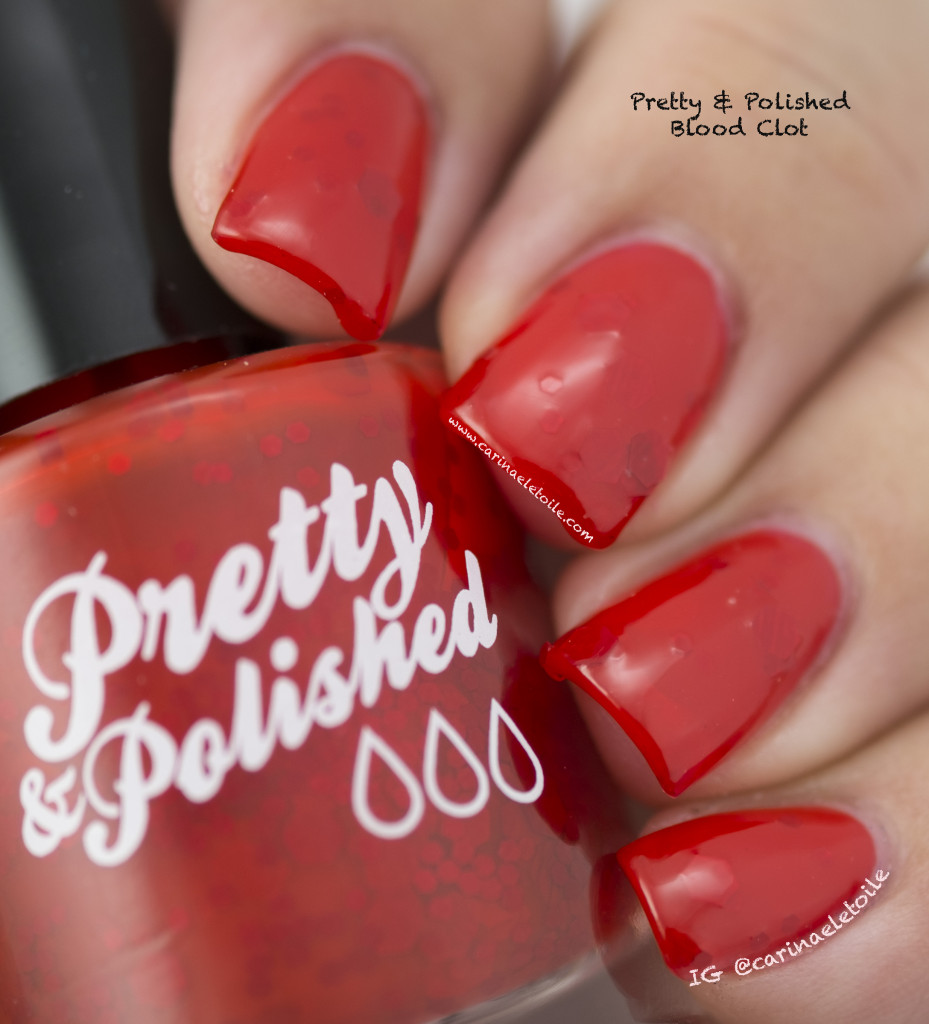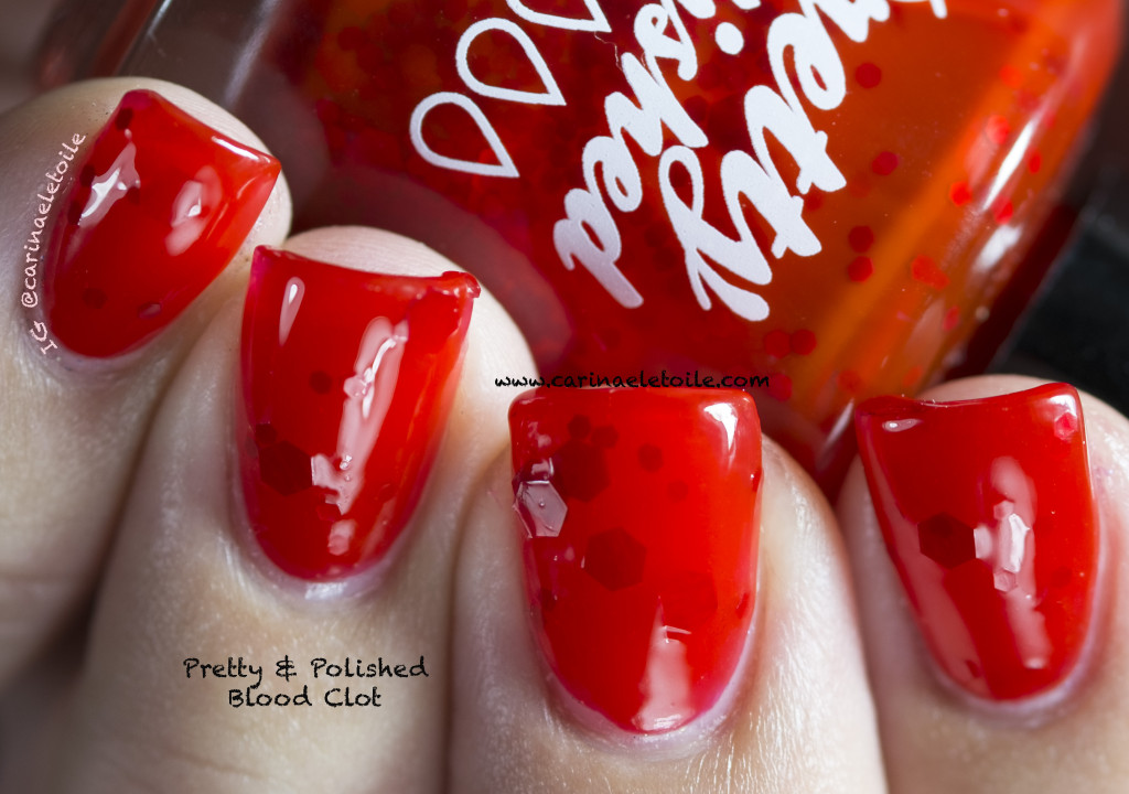Pretty and Polished Blood Clot is one of those reds that I love – not quite tomato and not quite true red, it falls into an ever so slight orange-ever so slight blue, but is so pretty that I have to wear it. It’s also a bit of a crelly as well, making this the kind of polish you need to have in your collection. It also contains large and small red hexagonal glitter. They show up in a subtle way. It hints to being there, but you have to look to find them.