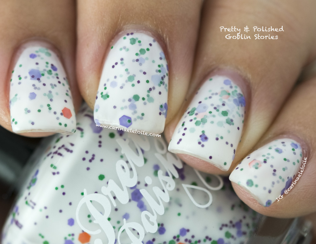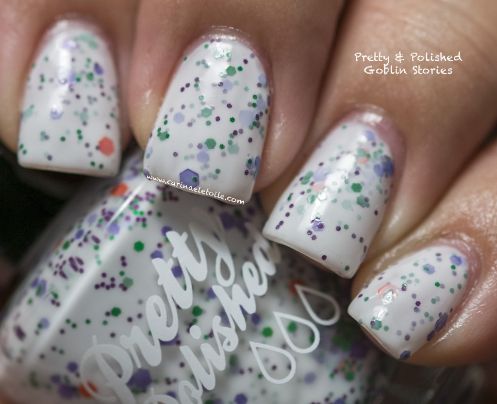 Pretty & Polished Goblin Stories is a milky white base with green, purple and orange with varied shapes of hexagonal glitter. Very pretty!