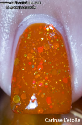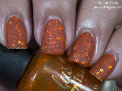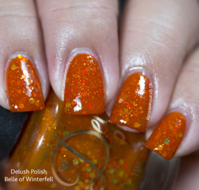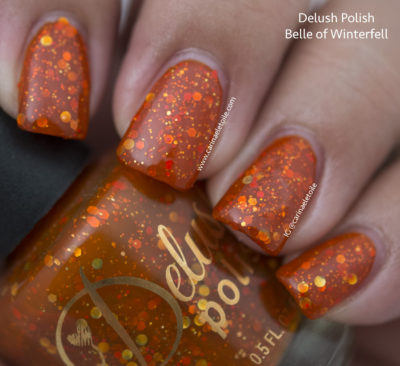 Delush Polish Belle of Winterfell is described as “Dazzling burnt orange jelly filled with a refined blend of microfine glitters and sparks of gold that will truly make you the belle of the land.”