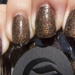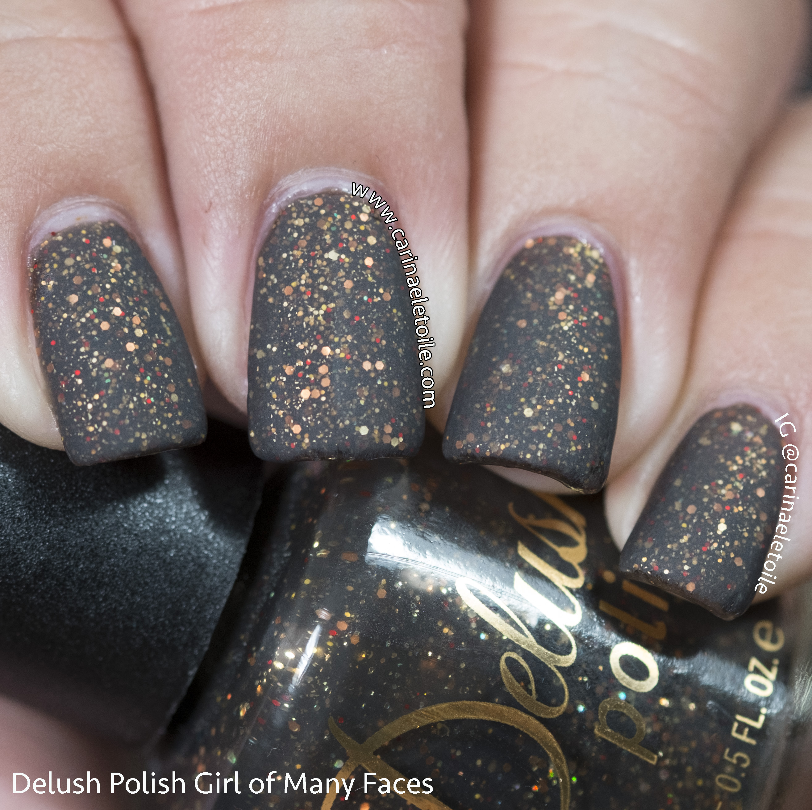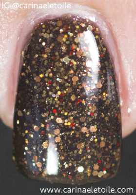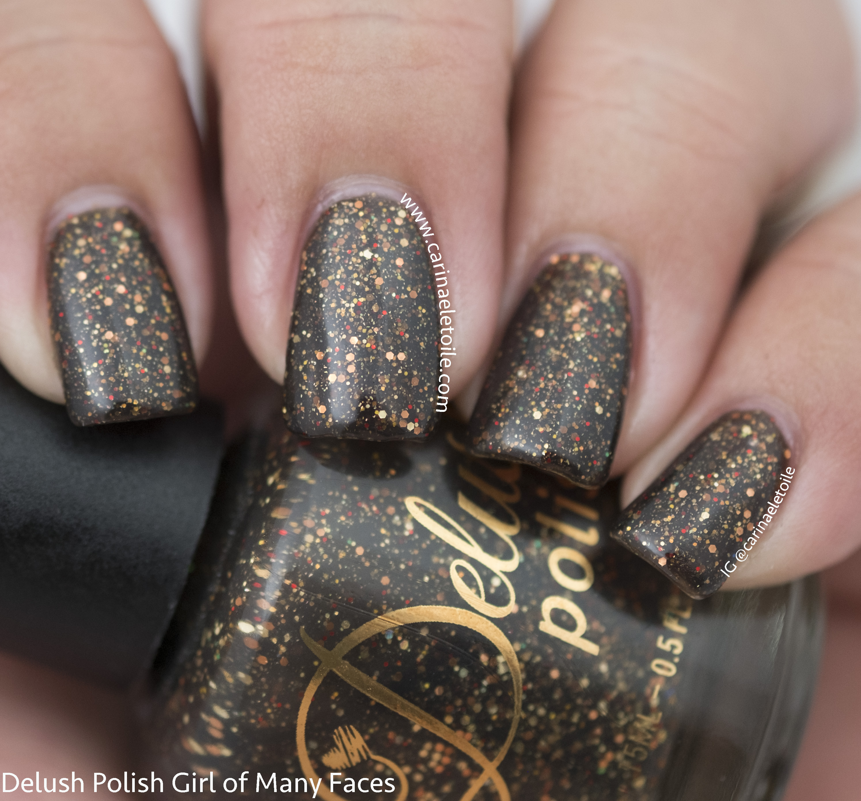 Anyway, I really like Delush Polish Girl of Many Faces because it’s a brown that actually doesn’t make my skin look ruddy or muddy. The glitter practically dances in the base. There is a small smattering of red glitter that stands out because it’s neither gold nor the base color of the polish. It winks at you and makes you want to find more of it within the polish.