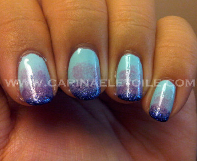 I used Finger Paints’ Blissfully Blue, OPI’s Done Out In Deco, China Glaze’s Grape Juice and Finger Paints’ Easle-y Entertained (it’s the dark glitter).