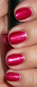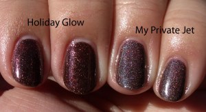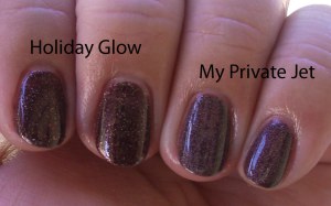 Ok, so I totally messed up. I did my index and middle finger with Holiday Glow and I got a phone call. I had a bottle of My Private Jet (which is NOT part of the OPI Holiday 2009 collection) sitting next to Holiday Glow and thought I was finishing putting on Holiday Glow. I noticed on the 2nd coat. I didn’t want to waste anything so I just kept them side by side. I have to say, they were easy to apply. I like both of them. They’re very pretty.