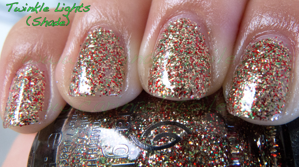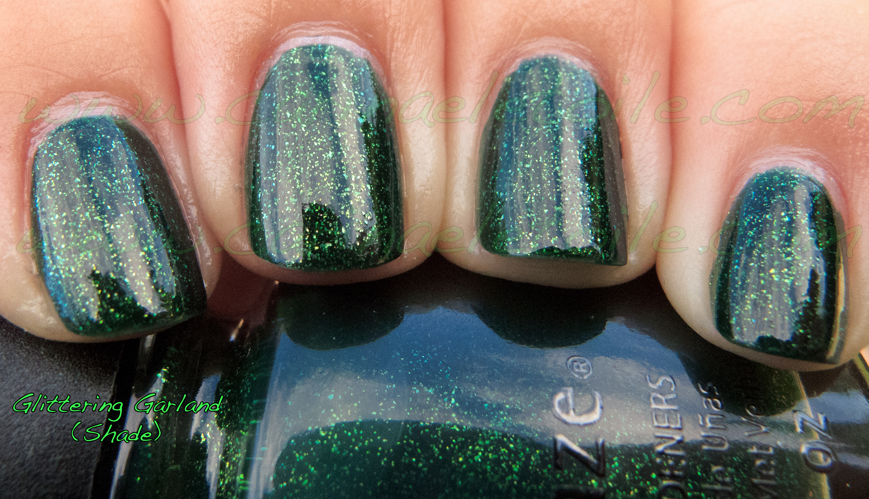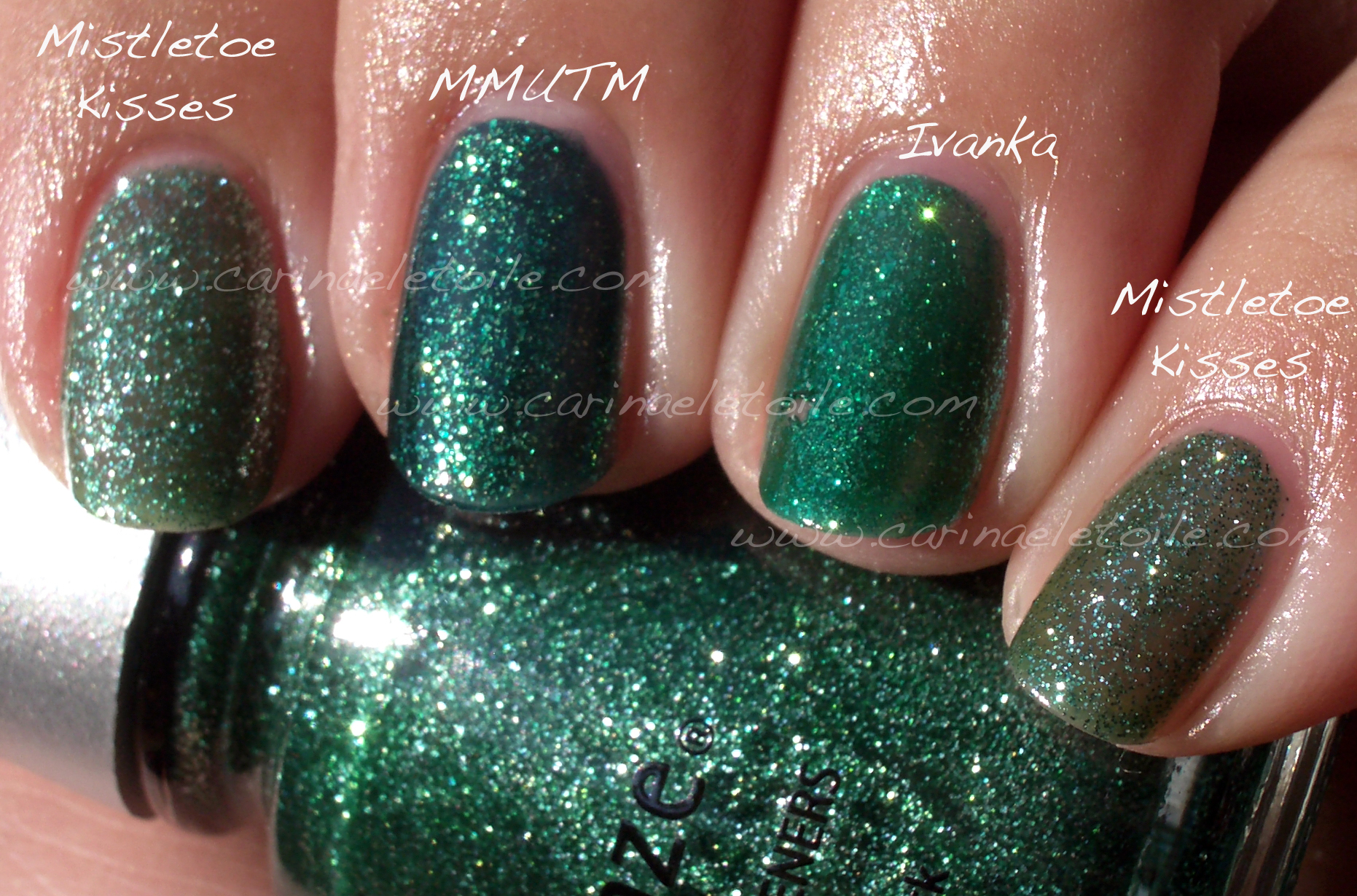 Glittering Garland is this pretty color that, for a brief moment, had me totally dying. Then I went, “Hey…have I seen this before?” I have. Below you will see a shot from last year, comparing Orly’s Meet Me Under The Mistletoe, Zoya’s Ivanka and China Glaze’s Mistletoe Kisses. I will have to do a side by side comparison of Orly’s Meet Me Under The Mistletoe and China Glaze’s Glittering Garland. For now, you will have to settle for a shot from last year.