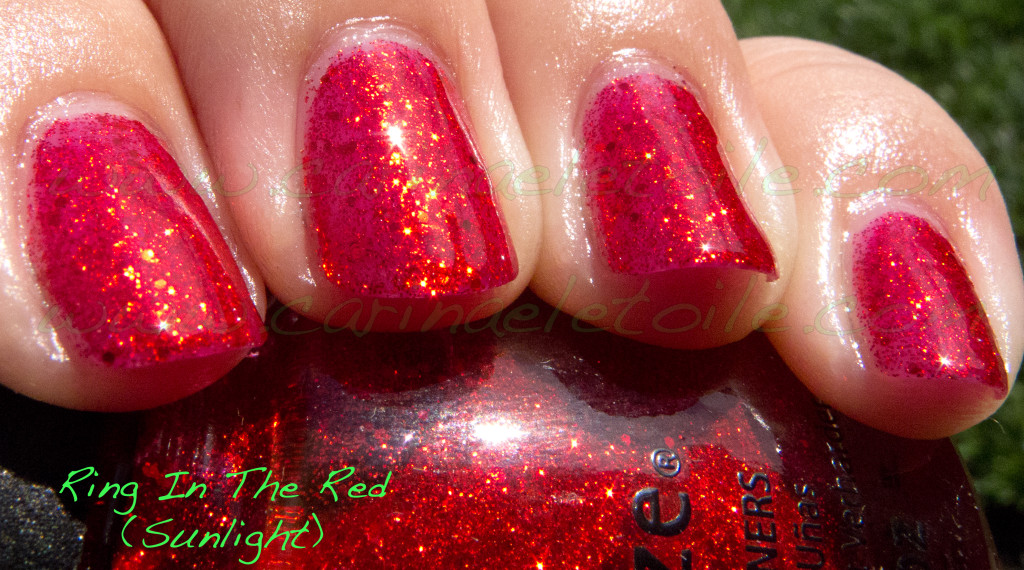 When I first saw this in the bottle, I went, “Oh dear…China Glaze is doing a Ruby Pumps. They’re ripping themselves off.” I was wrong. This has different shaped sizes of glitter in a red base. I happened to like this. At two coats, this really covered well. I would definitely sport this color – it’s really glittery and pretty…Can you see how some of the glitter tried to sparkle in the sunlight? It really delivers in person.