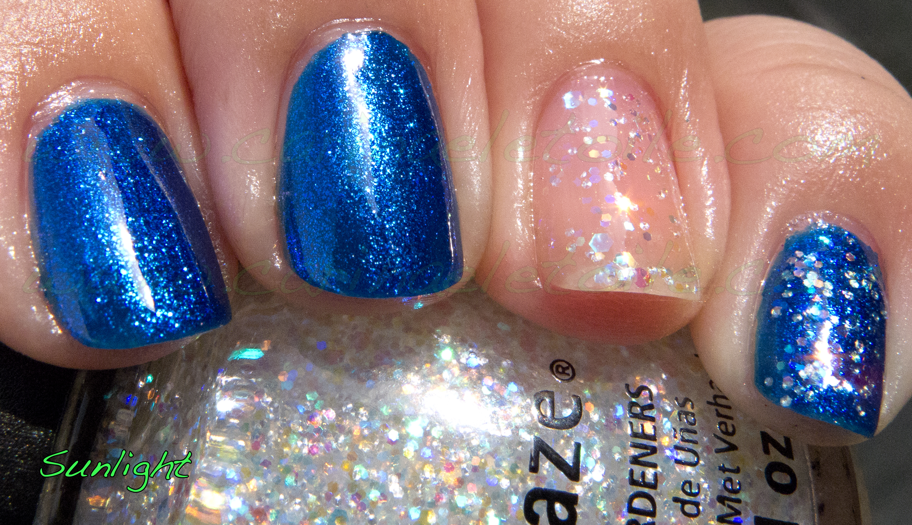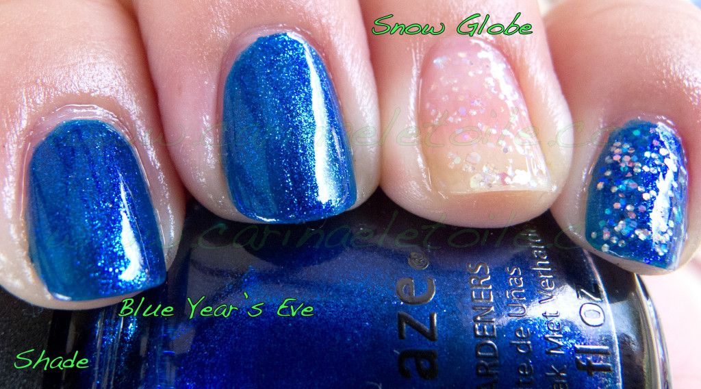 Blue Year’s Eve is on my pointer and middle finger. Ring finger is Snow Globe. Pinky is BYE with SG layered over it. BYE is almost foil-like again. Snow Globe is a re-release. It’s fun white glitter that has various shapes and a butt-load of iridescence.