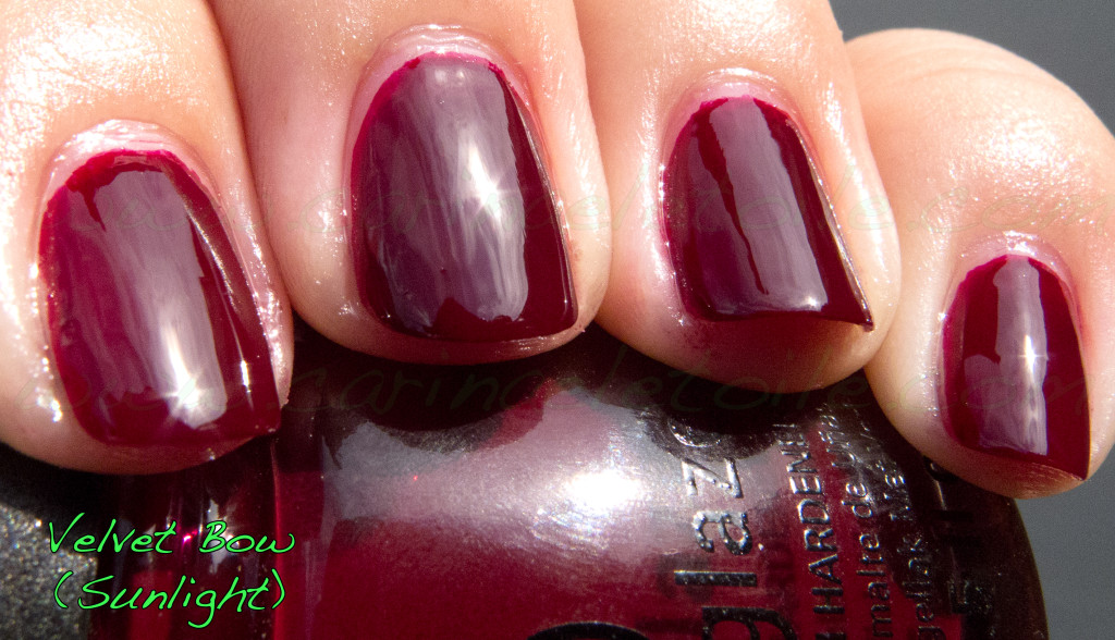 Velvet Bow was a nice almost wine-y red on me. A bit vampy. Really nice. However, I feel like I have a color like this in my collection.