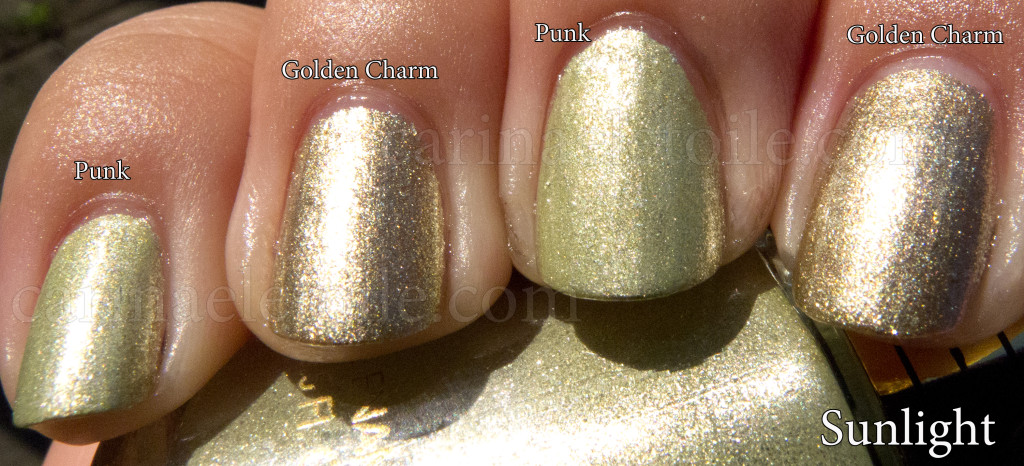 As for Golden Charm, I was expecting this booming gold that would rival tray-sures found from the depths of the ocean. Not so much. It’s a nice gold, but I feel it wouldn’t even be festive. This is too delicate. Too fussy…too…not what I was hoping for. Again, this felt like it was meant for spring. I like names for colors that actually describe them.