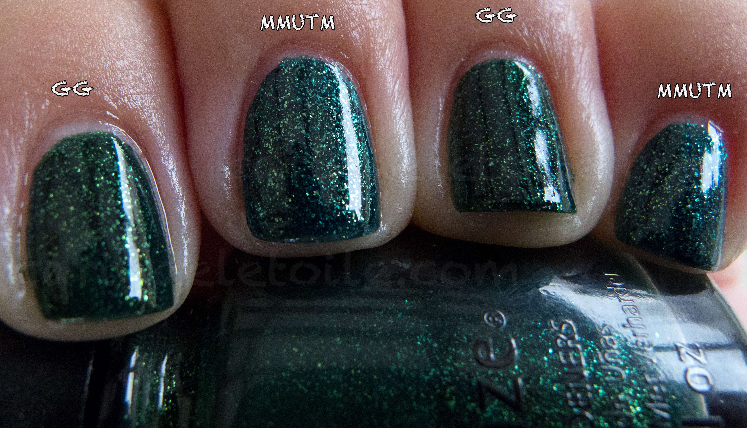 Overall, I find that Meet Me Under The Mistletoe has a bit more of a denser cluster of glass flecks. Almost like they just dumped extra glitter in! While I’m not complaining, it definitely is pretty. I’m glad I still have this in my stash! Also, thought it doesn’t show well in the photos (thank you non-sunny California day!), the bases for both of them are slightly different. GG is darker, almost like a blackened green jelly, whereas MMUTM is a couple of shades lighter, yet still a jelly. There are more glass flecks/glitter in MMUTM while the glitter seems sparser in GG.