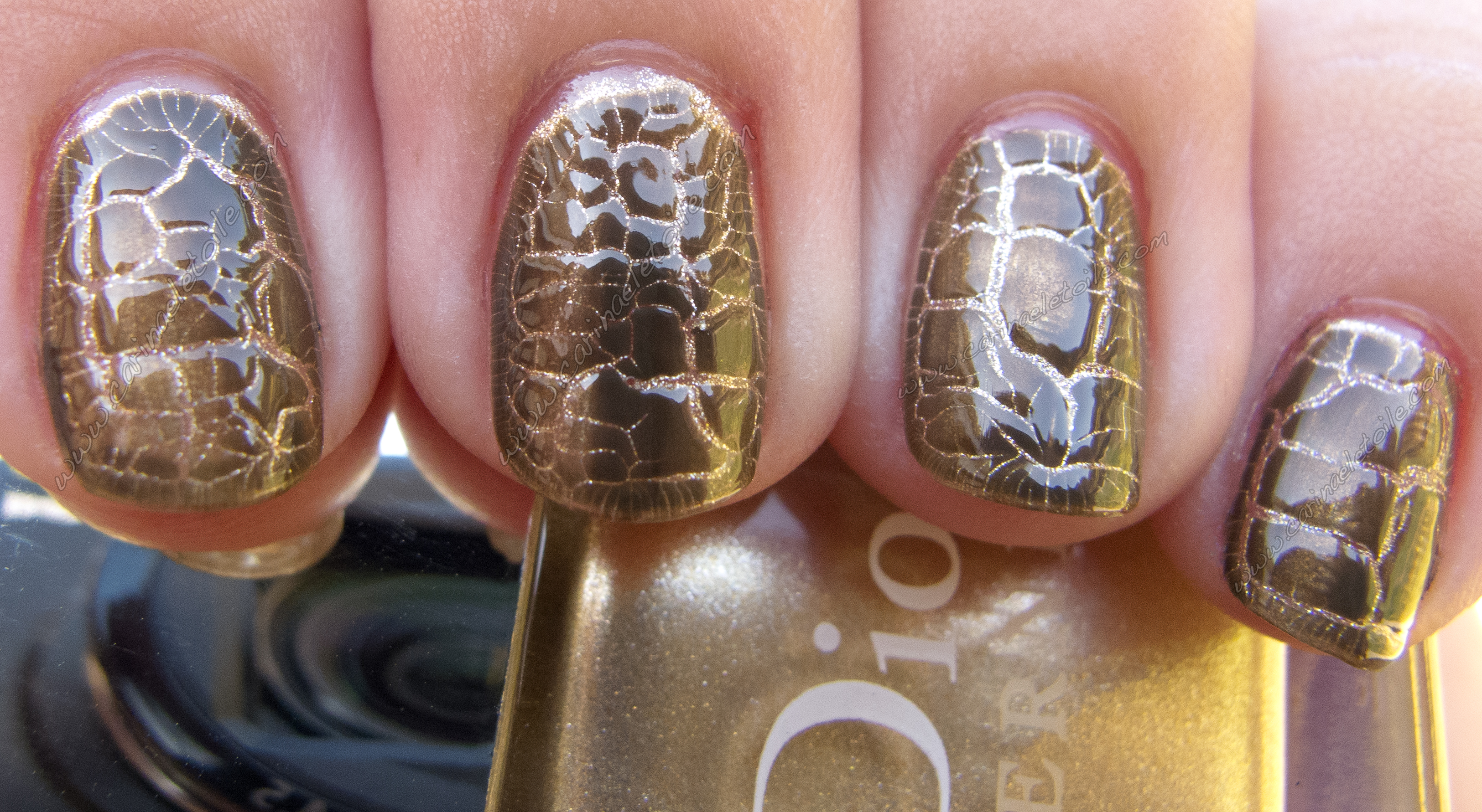 I applied one coat of the gold polish that was the first step of this, waiting about 3 minutes for it to dry and then added a thin layer of the crackle effect top coat. Now the crackle wasn’t immediate, but when it occurred, it was absolutely amazing – it almost mimicked the crocodile pattern I had seen on my mom’s crocodile clutch she has!