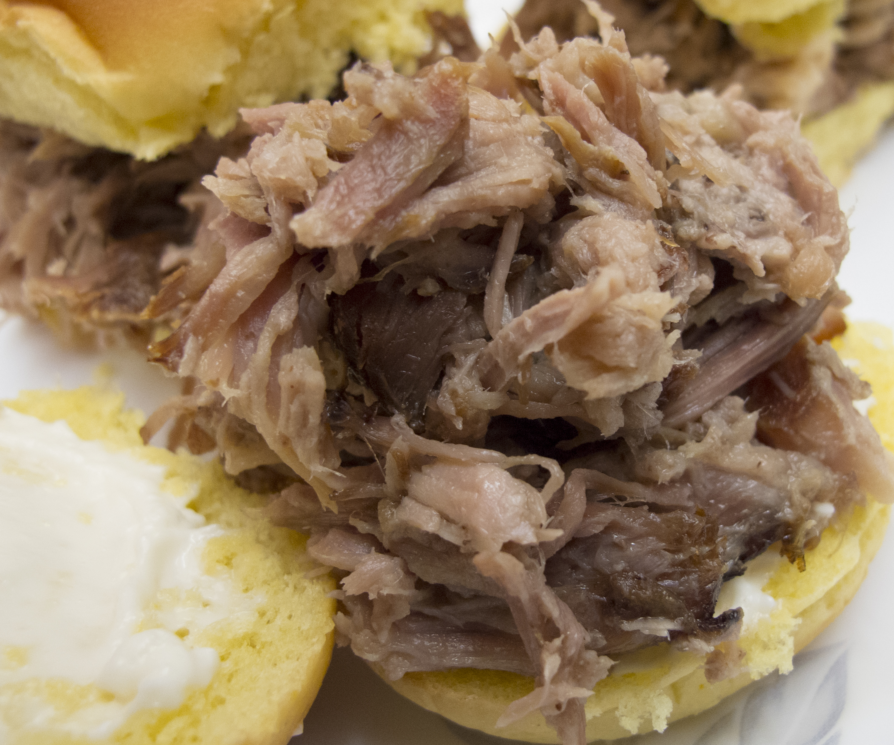 What’s a girl to do? Why…use a slow cooker and three basic ingredients: salt, pork butt (aka pork shoulder) and liquid smoke.