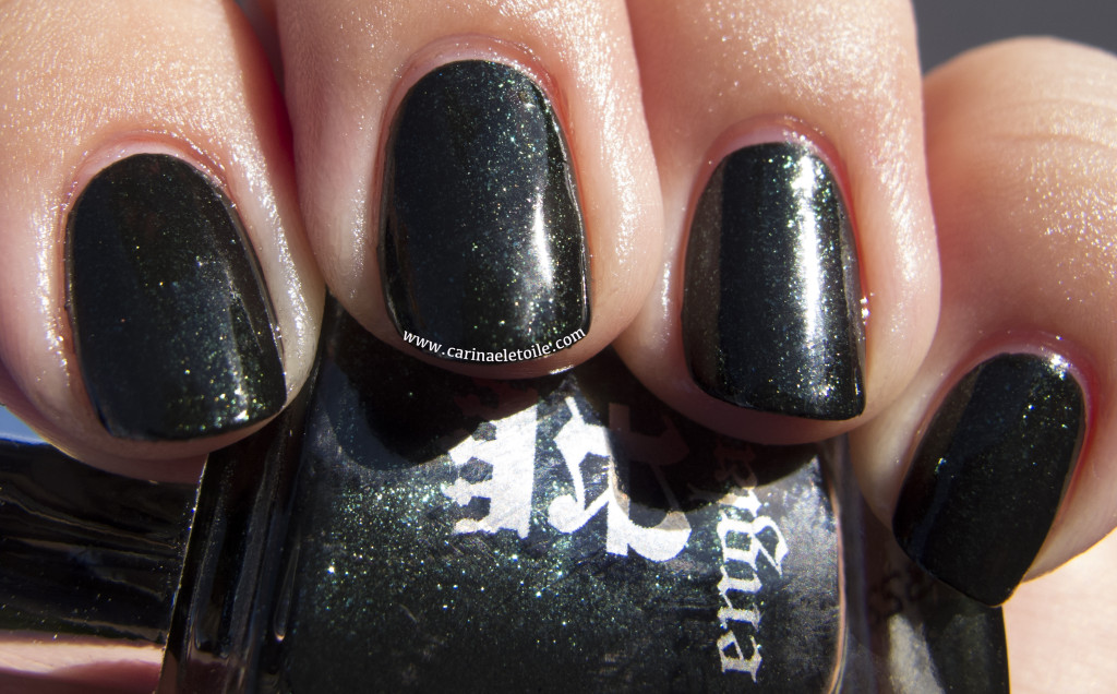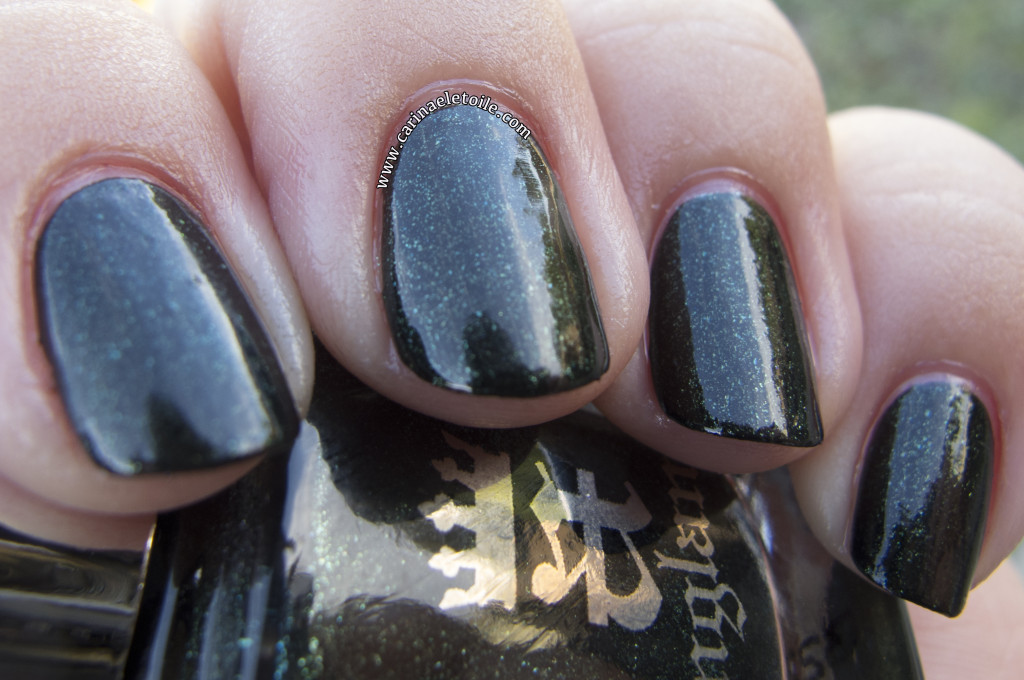 The shade shot of this is nice and mellow – it looks black with green flecks. Very respectable. Yet you can still see the bit of green dying to come and shine. When in the sun, it’s like the sun drowns out the green and leaves it to simmer gently…making the once black with green flecks blend into one, the colors working together making you wonder if it’s really green or black or a black green. It is really swoon-worthy.