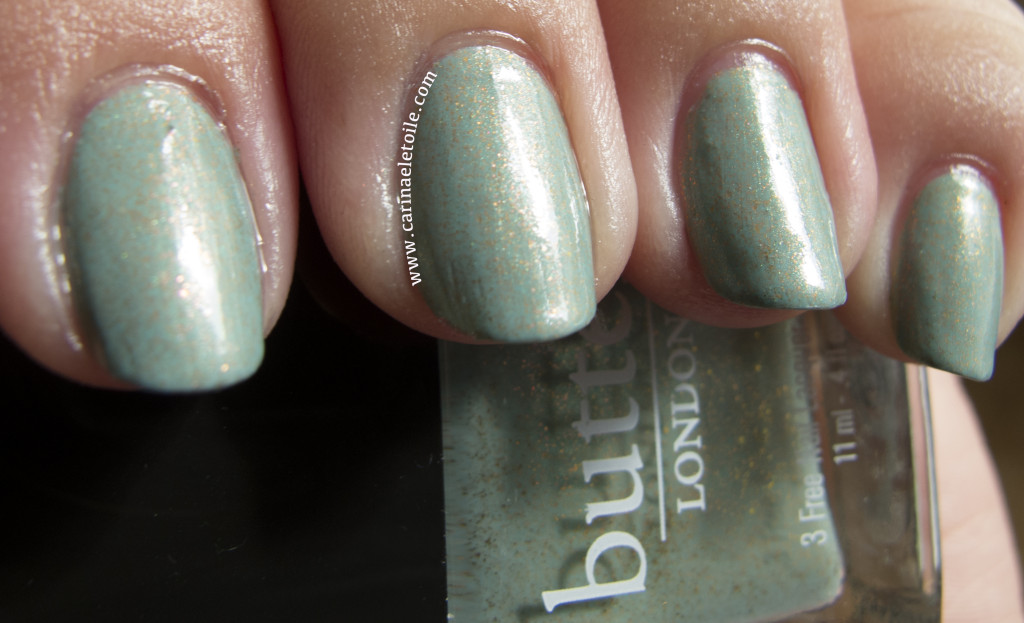 Why do I say odd? Because I’d never really think to mar a gorgeous base color such as this with some smattering of glass flecked/glitter that is a pinky-copper. On the site, Butter London describes Two Fingered Salute as “…Muted, patinaed green crème with copper microglitter“.