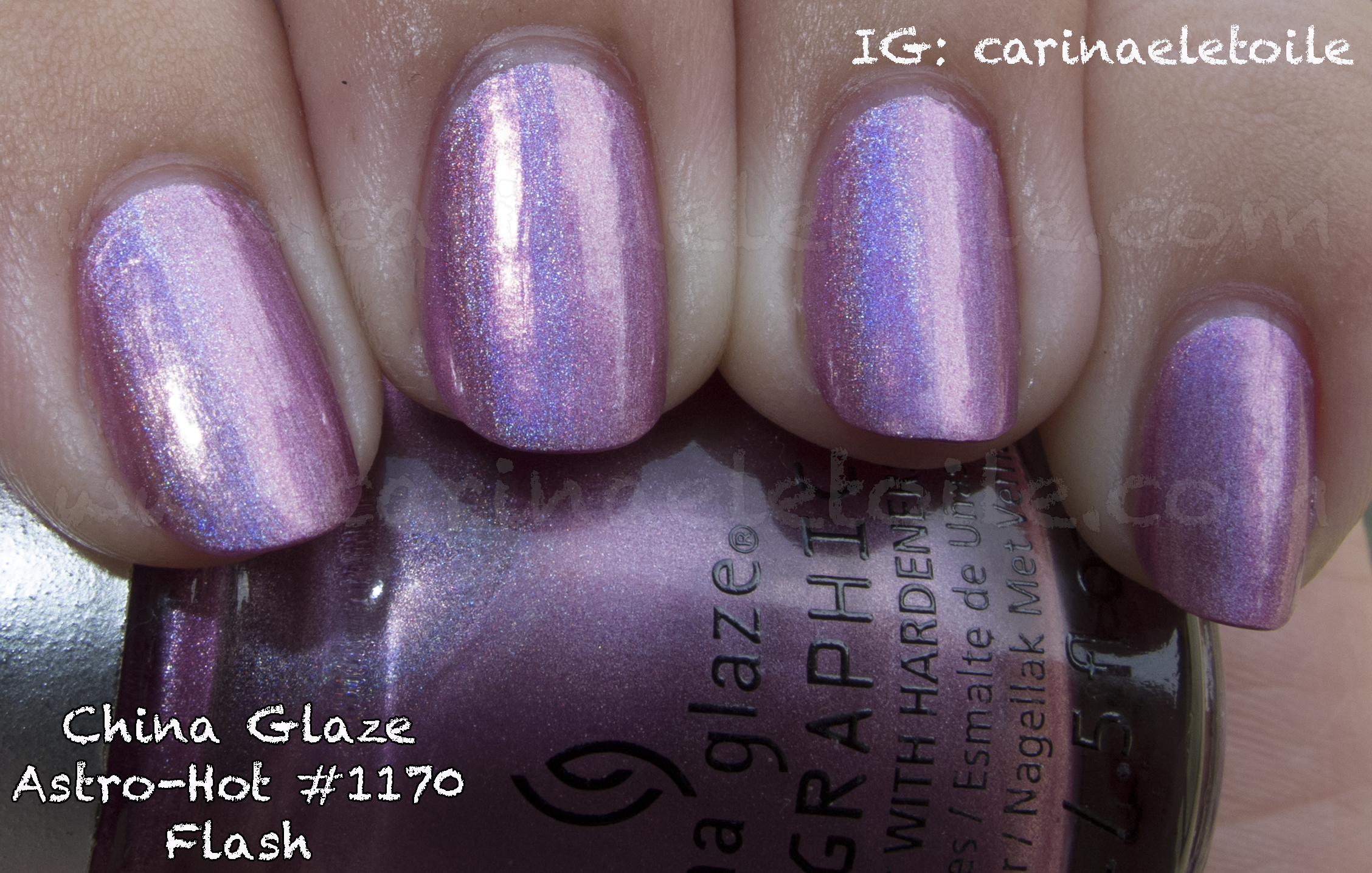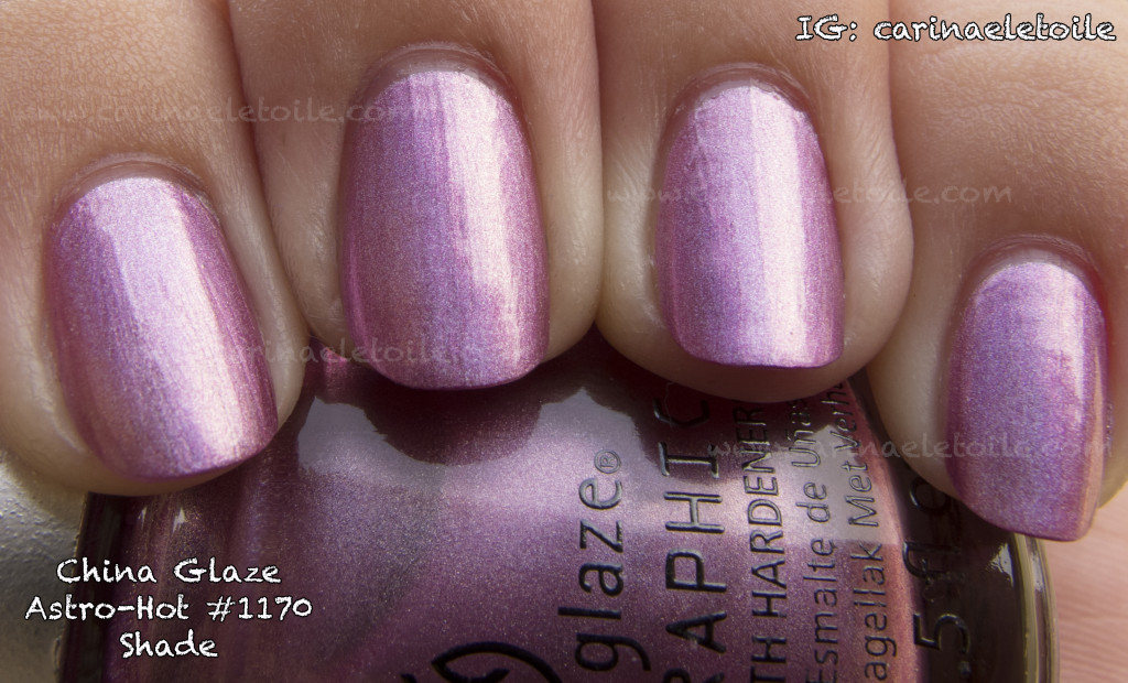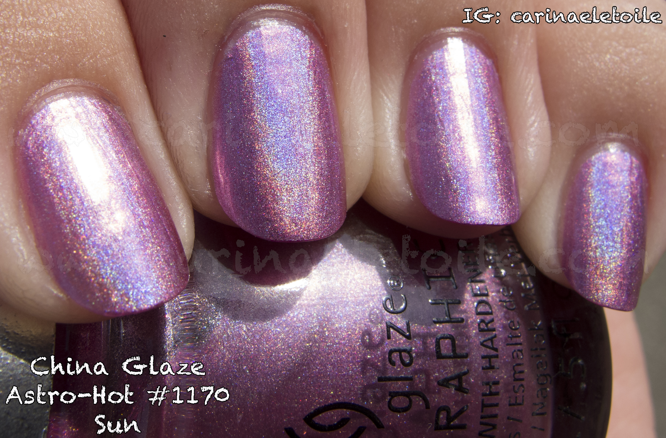 Astro-Hot is a deep baby pink that has a metallic aspect with a very strong holo that is prevalent in the sunlight and flash. It was barely discernible in the shade.